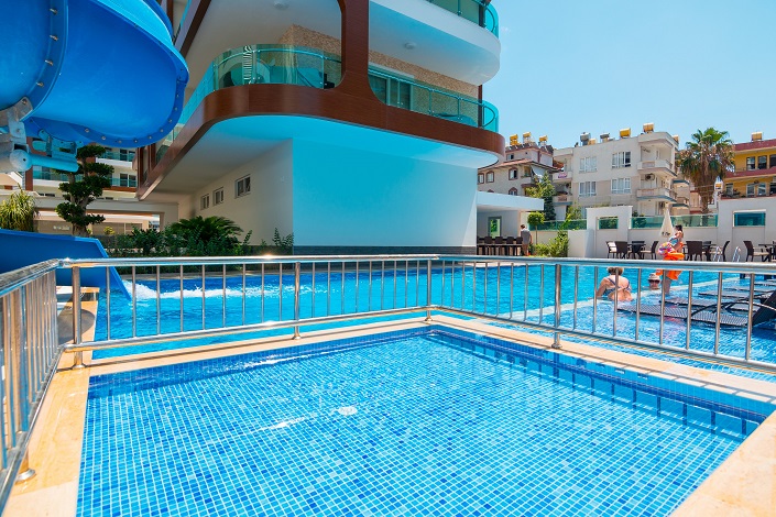Особенности комплекса: два открытых бассейна, водные горки, детский бассейн, бар у бассейна, общественные душевые кабины возле бассейна, детская игровая площадка, сад, крытый бассейн с подогревом, джакузи, сауна, тренажерный зал, настольный теннис.