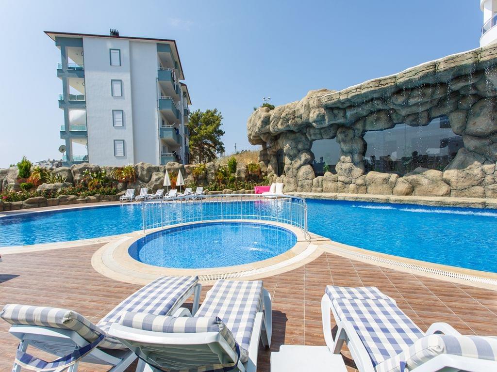 The complex is located in Alanya in the resort area of Avsallar, 900 meters from the sandy beach of Incekum (the smallest sand). On the protected territory of the complex there are 2 new seven-storey residential block. The complex is located on a hill, so from the first floor you can already enjoy a view of the Mediterranean Sea , swimming pool and garden.