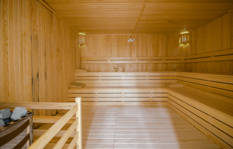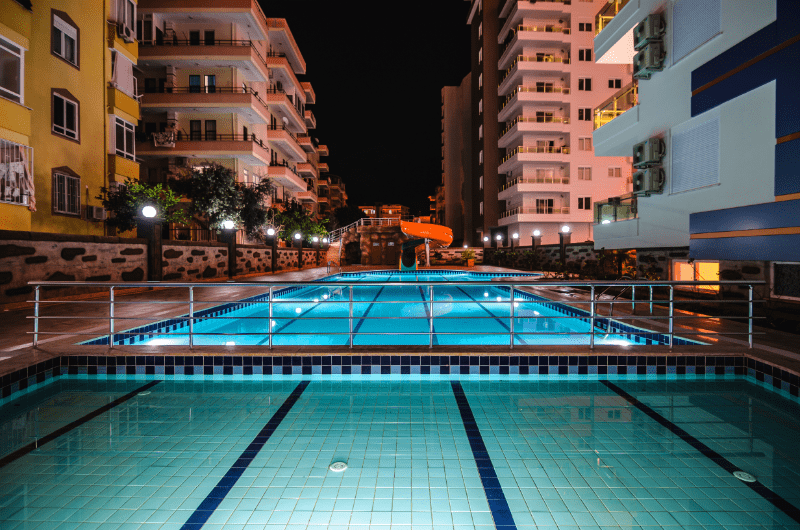 There is a swimming pool with a slide, a children's playground, a gazebo, a barbecue area, a sauna and a fitness room with billiards and table tennis.