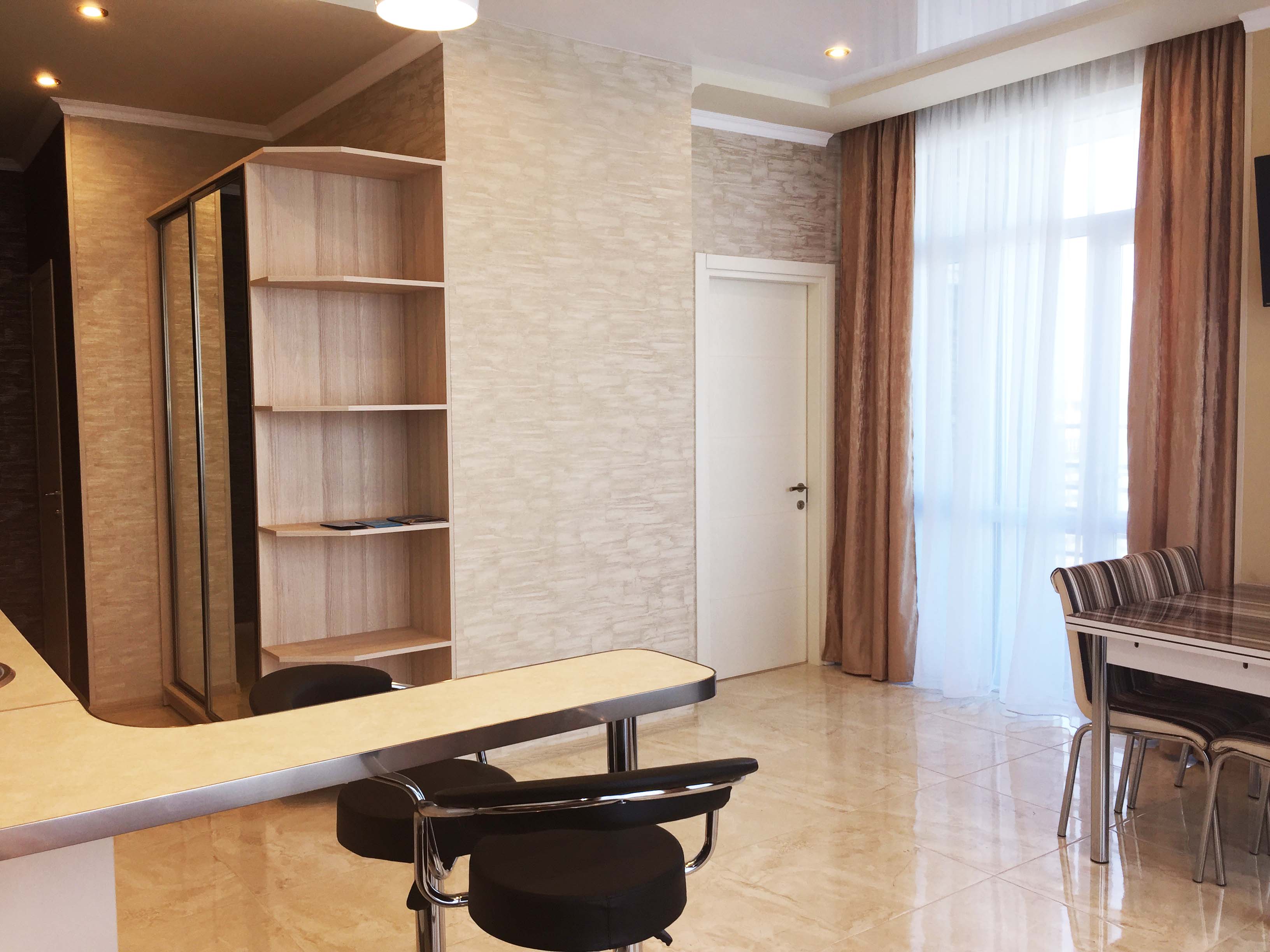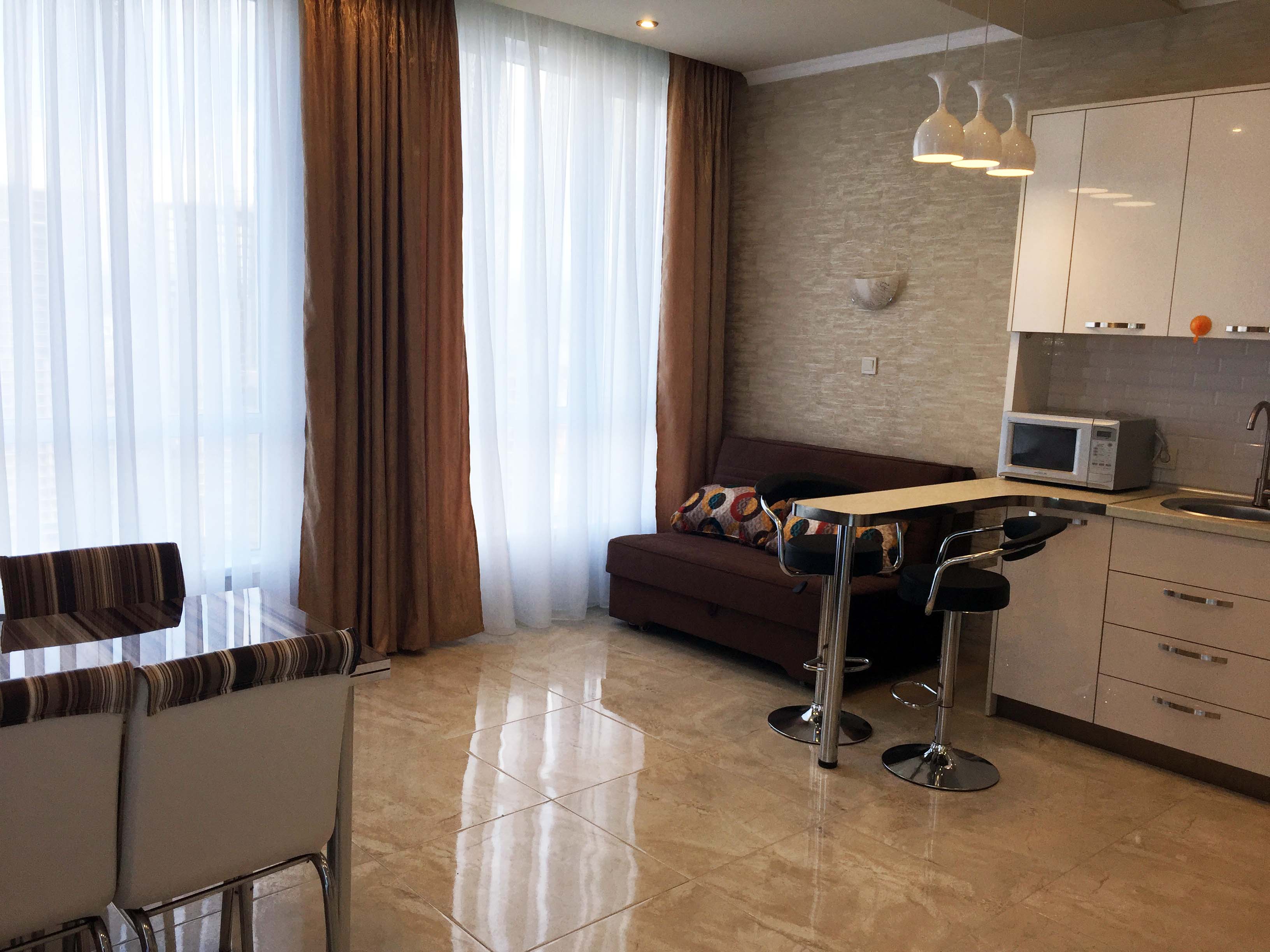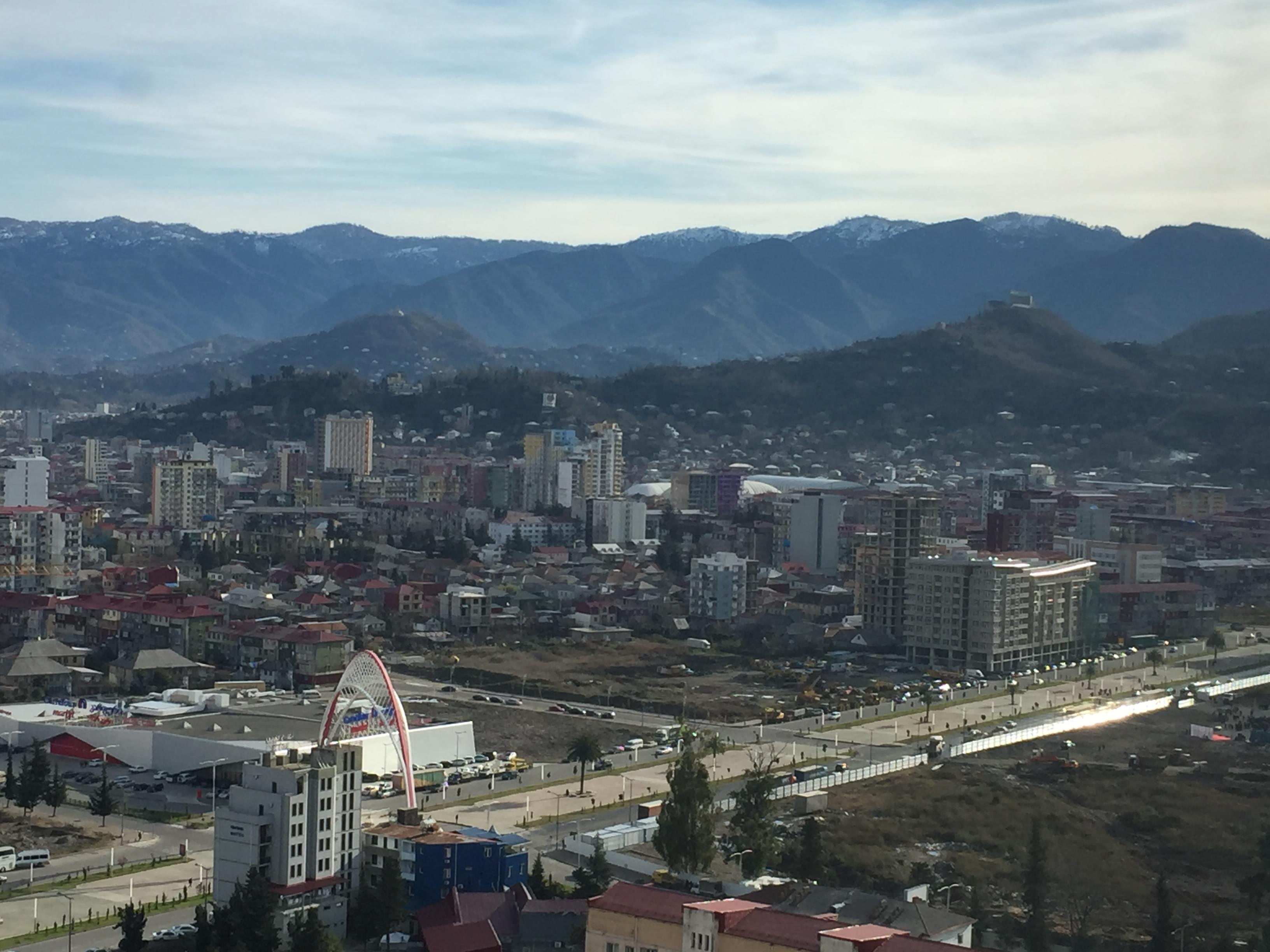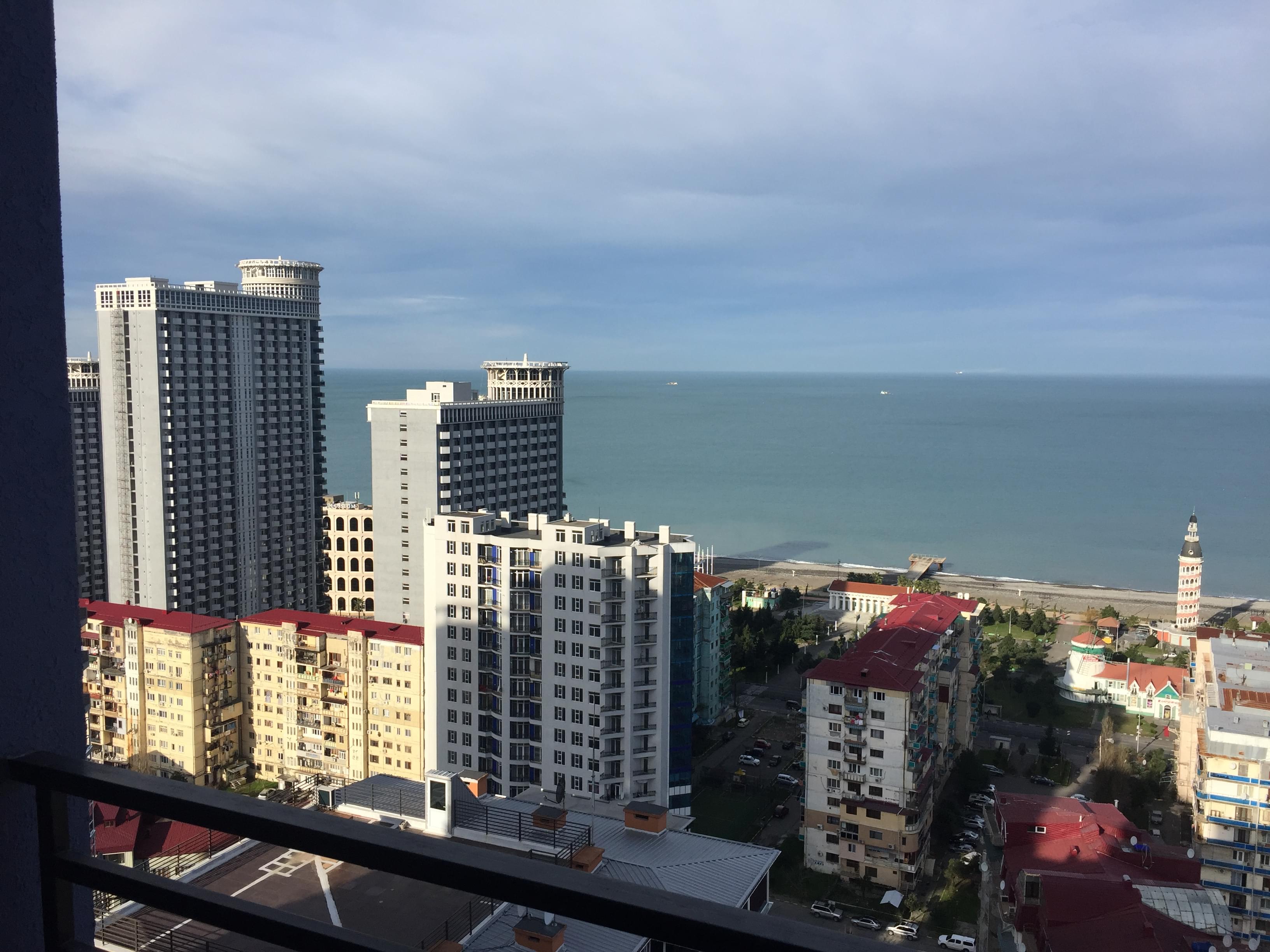 The apartment is 50 sq.m. located. in the heart of the resort life of Batumi, next to the singing fountains, the lake, the Aquapark, the house of Justice, a new international stadium is being built nearby, 10 min. drive to Batumi Airport, 15 min. driving to the border with Turkey. Nearby there are 3 large supermarkets: Yalcin (1 minute), Willmart 3 minutes, Carefour 7 min.) The apartment is located on the 24th floor of a new 25 storey building, which is 5-7 minutes. walk from the sea. From the windows of the apartment offers a magnificent view of the sea and the mountains, as well as the entire panorama of the city. All rooms with panoramic windows and sea views. What is unique for Batumi, which is massively built up by all new high-rise buildings that close the sea view to apartments on lower floors.