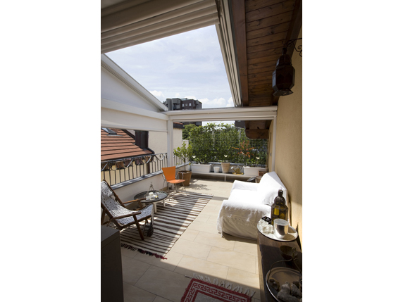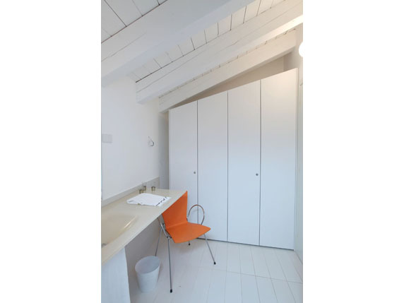 The apartment is composed of: a hallway, a multifunctional room which serves as a bedroom and living room with open kitchen, a powder room with built-in closets, bathroom and a wonderful 18 sqm terrace, which is fitted with a screen system designed by Corradi, which encloses the terrace in order to give it a unique privacy and allow it to be used during the entire year.