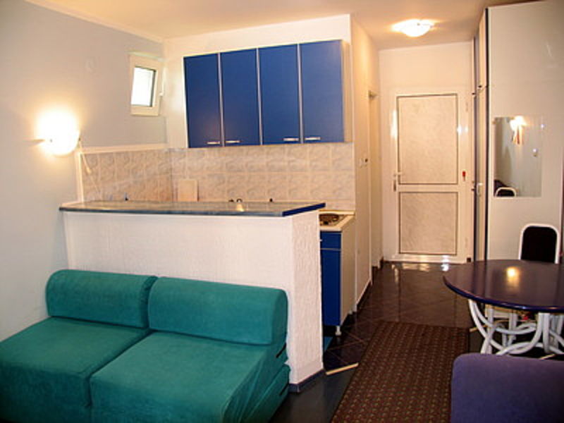 The apartment is on the first floor of a house in a nice area Podkoshlyun of the Budva city. Near the house is quiet, green courtyard. To the sea - 20 minutes walk. The actual size of the apartment is 26 m2. The apartment has a large living room-studio room with kitchen area and dining room, bathroom with shower and a bright sunroom. Beautiful interior decoration. New windows, modern tile and plumbing, air conditioning. The apartment is sold with all necessary furniture and household appliances.