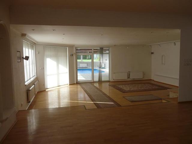 На первом этаже находится холл, просторная гостиная с камином, кухня, кабинет, туалет, бассейн с подогревом (8х4 м.) и выходом в палисадник. На втором этаже – 3 спальни со встроенными шкафами (одна из них имеет выход на террасу), ванная комната, туалет. На третьем этаже, который использовался для гостей, находится большая комната, кухонный бокс, ванная. В подвальном этаже дома имеется техническое помещение с котлом, склад, место для сушки белья. В палисаднике – облагороженная, крытая площадка с камином. В доме также есть телефон, видеотелефон, сигнализация, спутниковое телевидение.