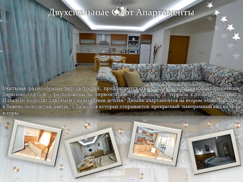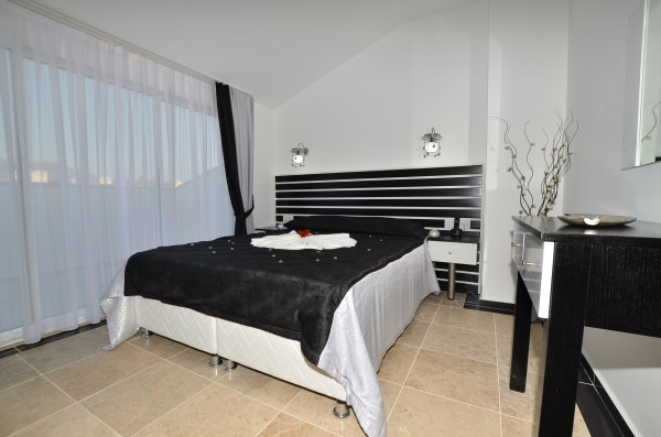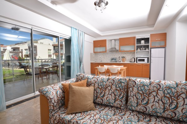 The luxury 21 apartments are innovatively designed residential apart-hotel with elegant and contemporary architecture that captures the spirit with first step inside. The hotel are situated in a superb location and only 250m walk from the seemingly endless and action packed beach of Calis, with plenty of food shops, bar and restaurants within easy reach and a 10 minute walk to the resort centre. The complex is a charming collection of one and two bedroom apartments in separate blocks built around and overlooking a large communal swimming pool that have been thoroughly designed to offer comfortable and intelligent space saving solutions to maximise space and to suit different family needs. Each accomodation unit has a living room with a flat-screen TV, seating area with sofas and floor-to-ceiling windows that open either to a balcony or patio. Well-equipped kitchen comes with an oven, stove and a refrigerator. A microwave, electric kettle and a large dining table are all provided.There is also children’s pool,private parking place and extensive well kept landscaped gardens offering plenty of room to swim, sunbathe, or relax. The large terraces with BBQ overlook the swimming pool with distance mountain view and ideal for alfresco dining on those warm summer evenings. Fethiye city centre is 5 km, Dalaman Airport is 39 km from the complex.
