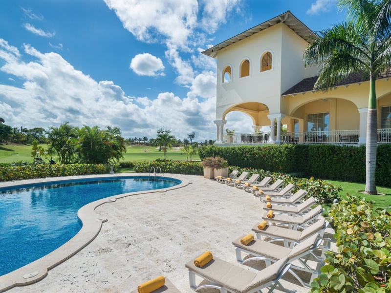 Villa with three bedrooms and beautiful view on the golf course in a quiet residence Punta Blanca. The villa has one level, three bedrooms with showers and dressing rooms, maid's room, guest bathroom, laundry area, dining area, kitchen, covered terra...