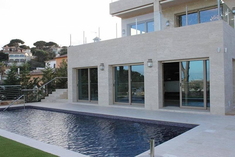 Новая элитная вилла 550 кв.м. с бассейном и видом на море на участке 10 с. в привилегированном городке Калонджя на Коста Брава в 40-ка км. от Жироны. На первом этаже меблированная гостиная со столовой, камином, выходом на террасу, ТВ залом с камином...