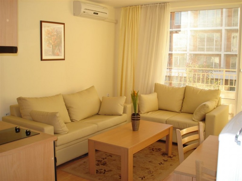 Zu verkaufen ist eine gemütliche 2-Zimmer-Wohnung im 3. Wohnstock im Komplex Raduga in Sveti Vlas. Sie besteht aus Wohnzimmer mit kleiner Küche, Schlafzimmer, Badezimmer plus Toilette und Terrasse. Die Wohnung ist voll möbliert und mit Haushaltsgerä...