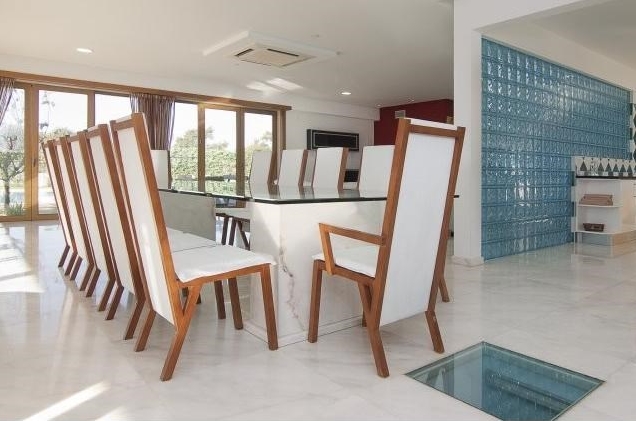 Behind the house are located saltwater pool surrounded by gardens and lawns, and a wooden deck.