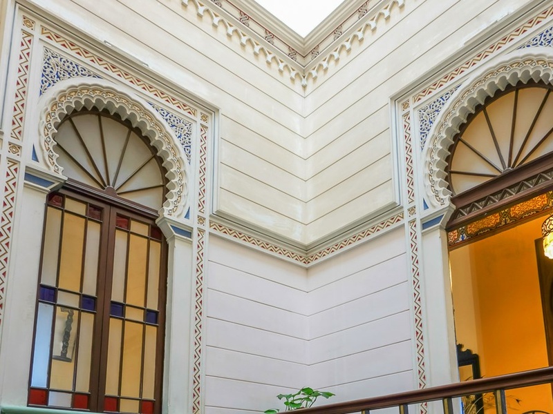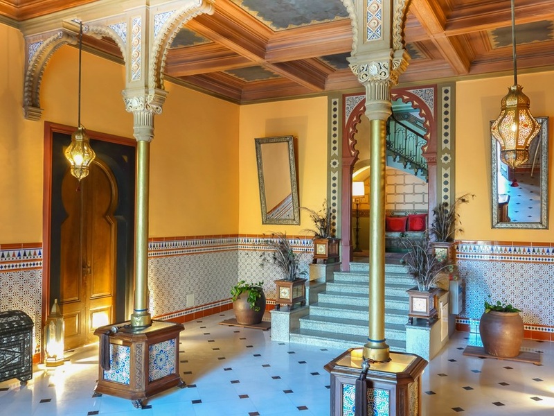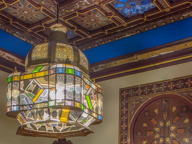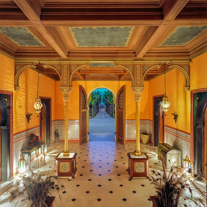 Арабский фасад виллы и элегантные двери приглашают в красиво украшенную комнату для приема с разрисованным от руки деревянным потолком и позолоченными колоннами.