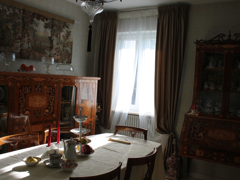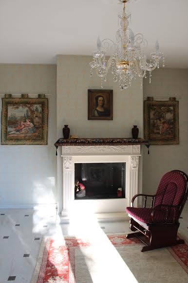 На первом этаже расположен вход с крыльцом с колоннами тортильон. Гостиная с авторским камином ручной  работы, столовая  суникальной инкрустированной мебелью стиле интарсия.