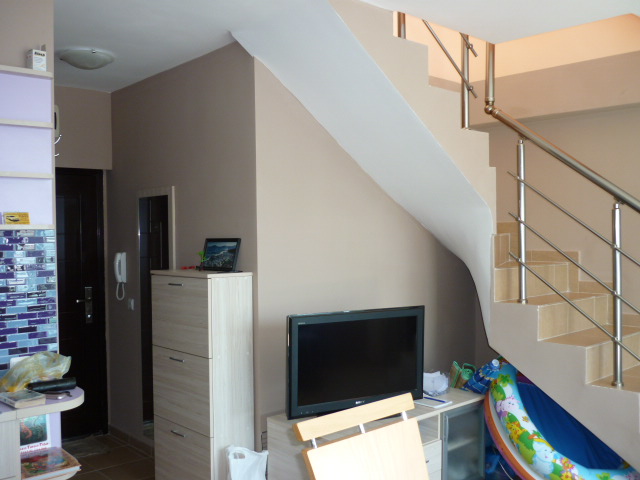 Two bedroom apartment is located in the town of Pomorie on the first sea line. The duplex apartment has a beautiful sea view! The apartment is located on the 4 and 5 floors and consists of: First level - living room with kitchenette, bedroom, bathroom, balcony Second level - bedroom, bathroom, balcony The apartment comes fully furnished.