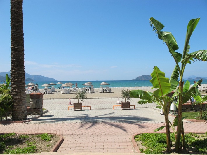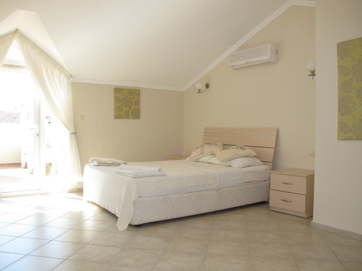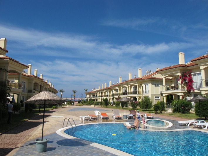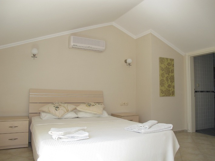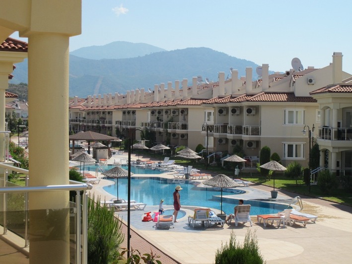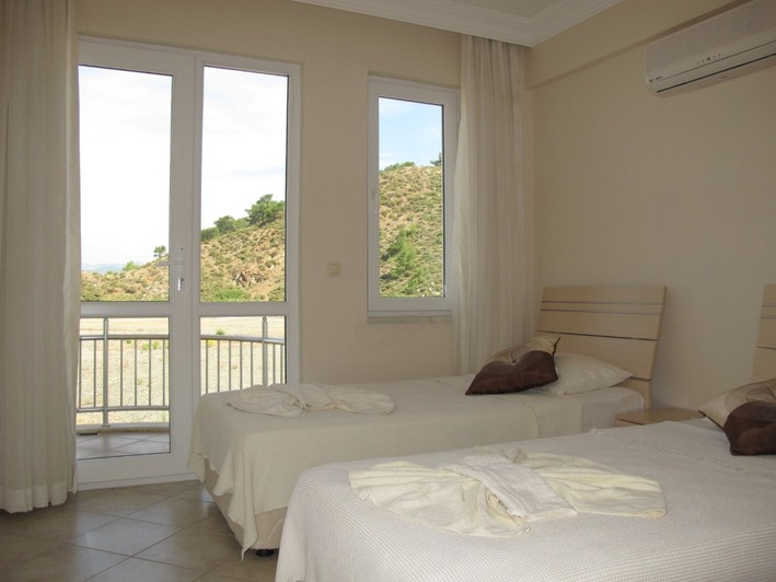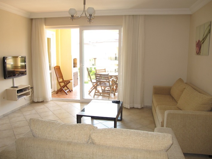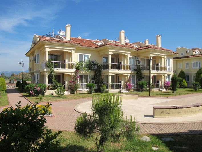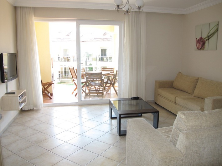 The property is uniquely situated within the water-featured Calis Sunset Beach Club, boasting an elevated position overlooking the multi communal swimming pools and gardens. Set on two upper floors with large balconies, it provides a fantastic overview of the Sunset Beach Club, where if you wish you can sit morning, afternoon or evening overlooking all the activities of the other club members. Alternatively you can join your fellow holiday-makers in congenial conversation around the pool bars and gardens. The interior of your apartment is air conditioned throughout both levels, it is pleasantly designed with the decor being furnished throughout to a high quality. For your family entertainment, the lower level open-plan design, supports a comfortable high quality living area including TV along with an extensive fully fitted kitchen within the adjacent dining area. The immediate lounge area opens on to it’s own BBQ balcony overlooking the Sunset Beach Club swimming pools and gardens. Two lower level bedrooms with their individual terraces are fully furnished with adequate storage space and the upper master bedroom enjoys a spacious roof terrace.
