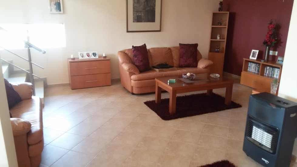 High Spec Detached House for sale, Furnished, 3 Bedrooms, 2 Bathrooms, central heating, garage, garden, balcony, driveway, off road parking, the house has a total built up area of 270 sq. metres, all rooms being tiled, and a yard with a total area of 1180 sq. metres. A stainless steel banister encloses the tiled stairway, which leads to the front door.