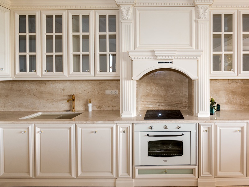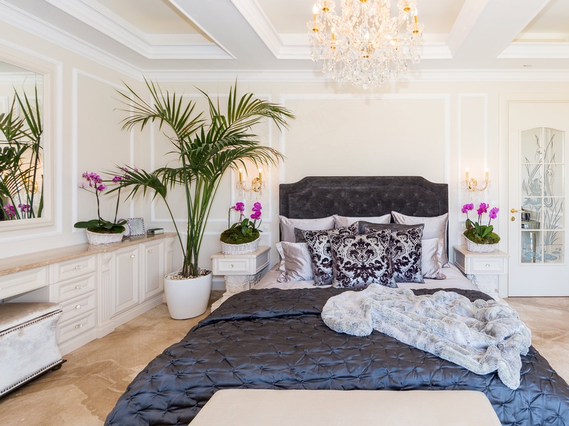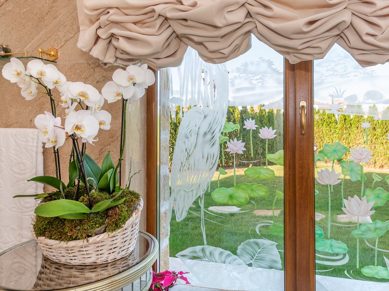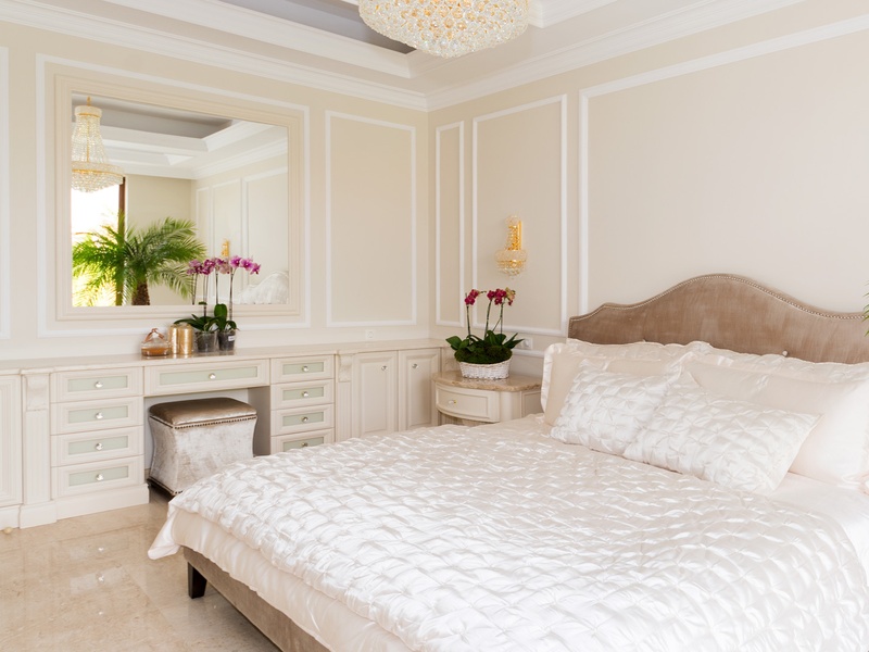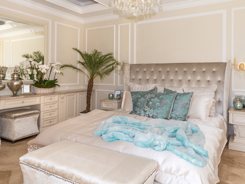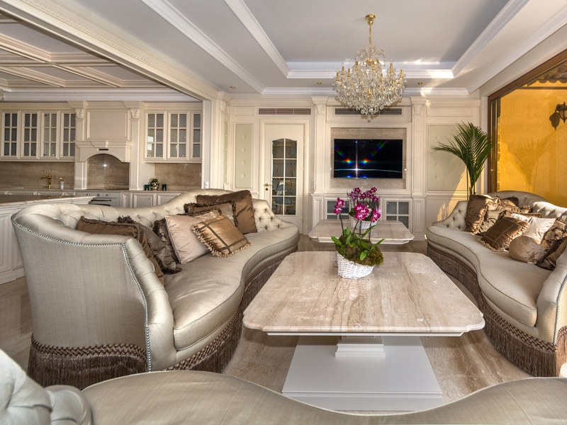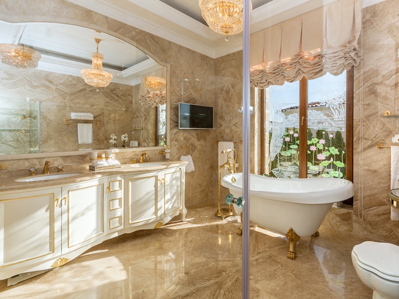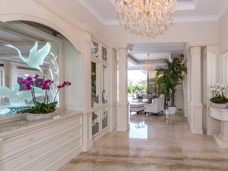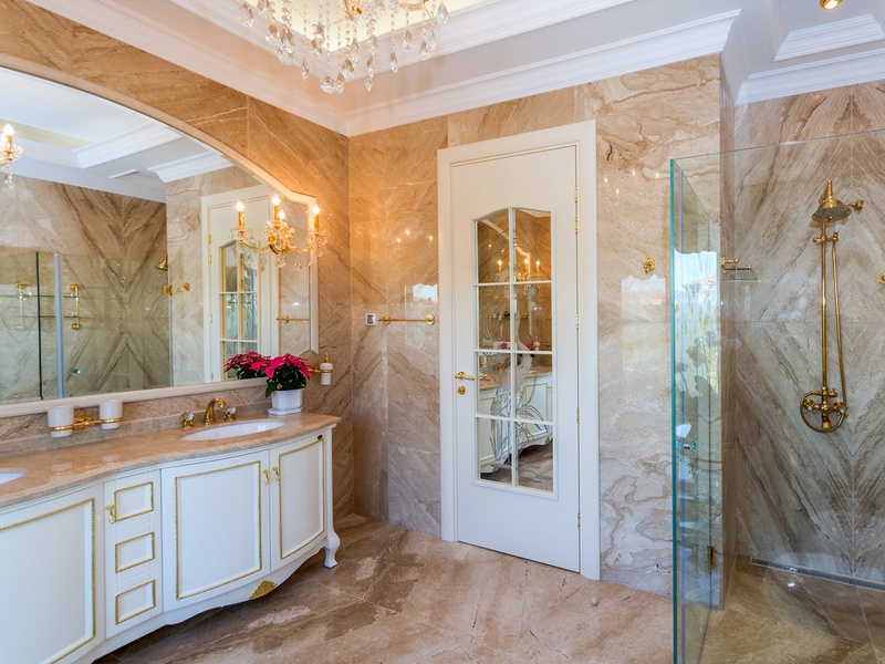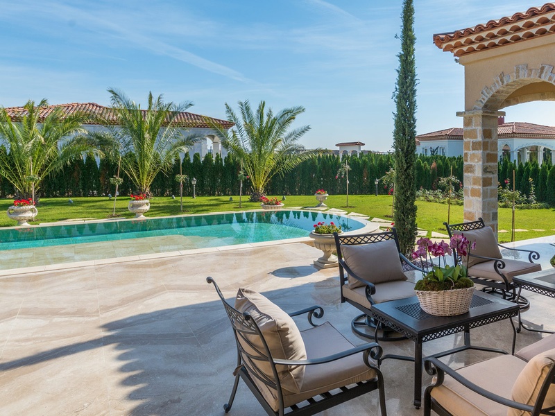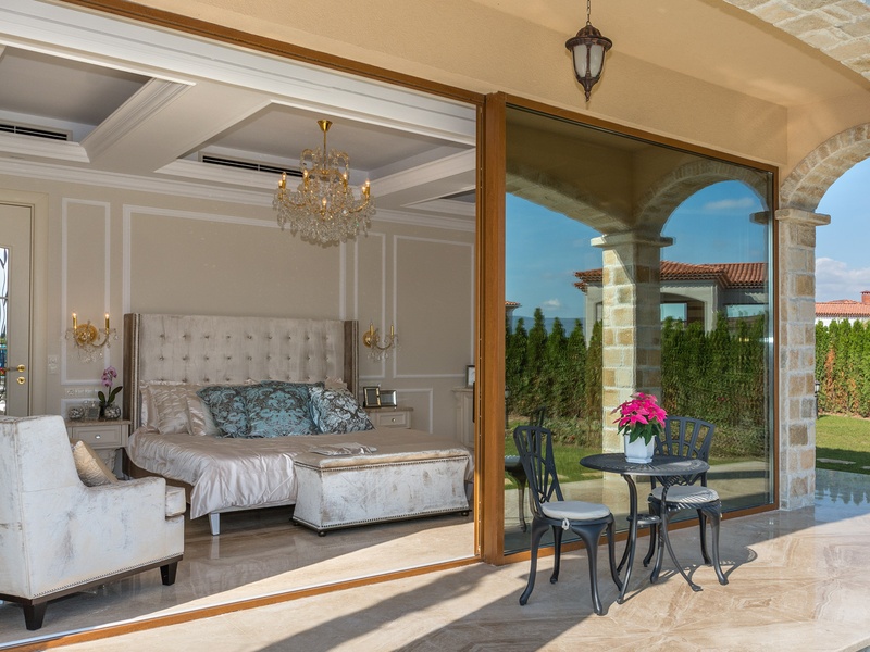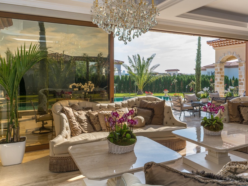 Through the impressive entrance you get into a spacious living room. The living space and the kitchen are in an open space ensemble. There is a large dining room with a table for ten and a kitchen.  The living room has areas for relaxation and areas to have fun, and a large fireplace. East of the living room is a veranda to which one gets through large windows that can be opened up to form a big passageway, ideal for late night parties. There are three double bedrooms with en suite bathrooms and walk-in closets. The living room and two of the bedrooms overlook the backyard garden and the pool. The large swimming pool tiled with natural marble (Daino) lies in the centre of the garden. The garden itself is large and leafy, planted profusely with exotic trees and flowers, with space for deckchairs around the pool. The furnishings of the house are luxurious and very elegant, with custom-made furniture. The interior is made up of fine natural materials, natural marble Daino, and wood.