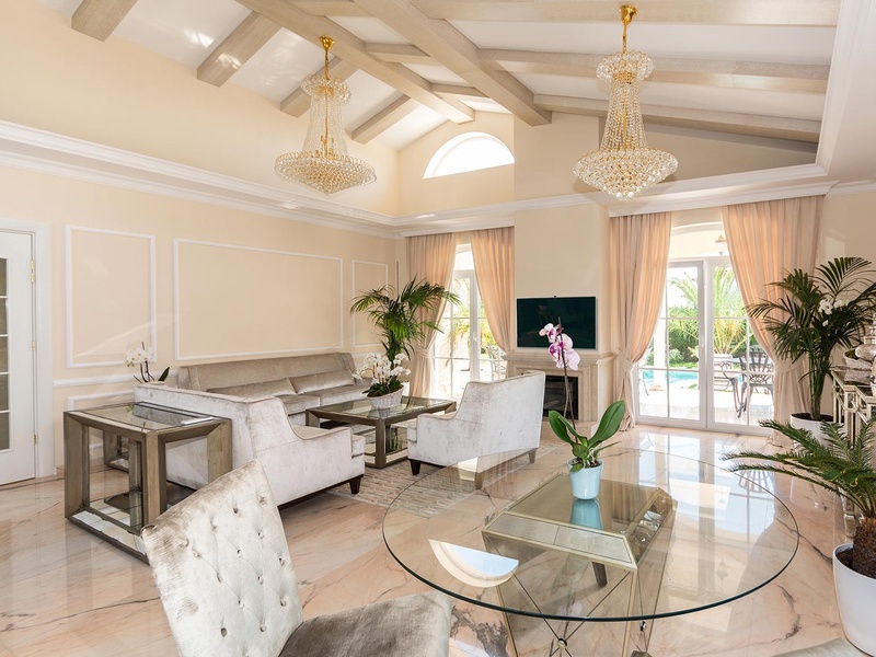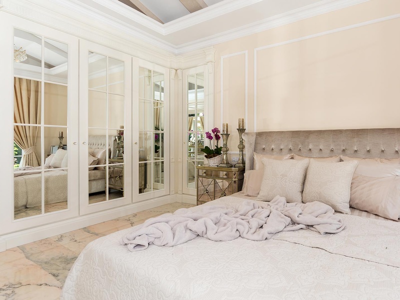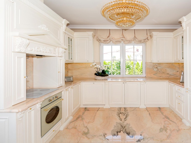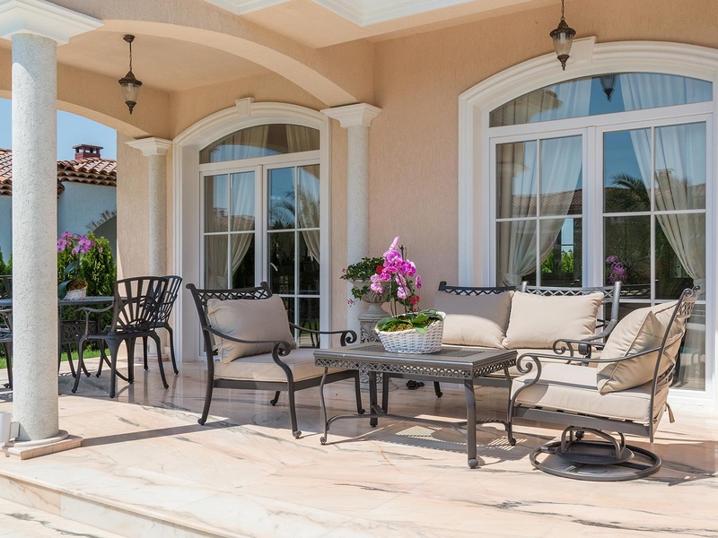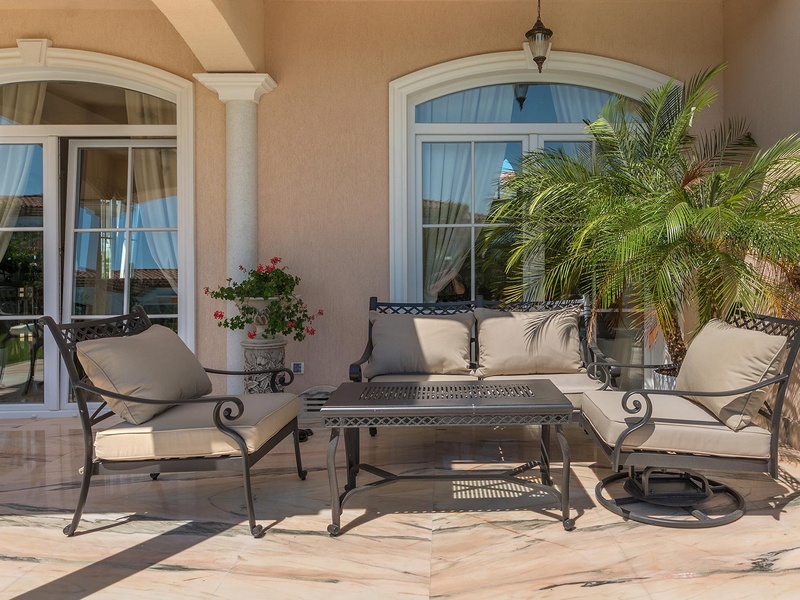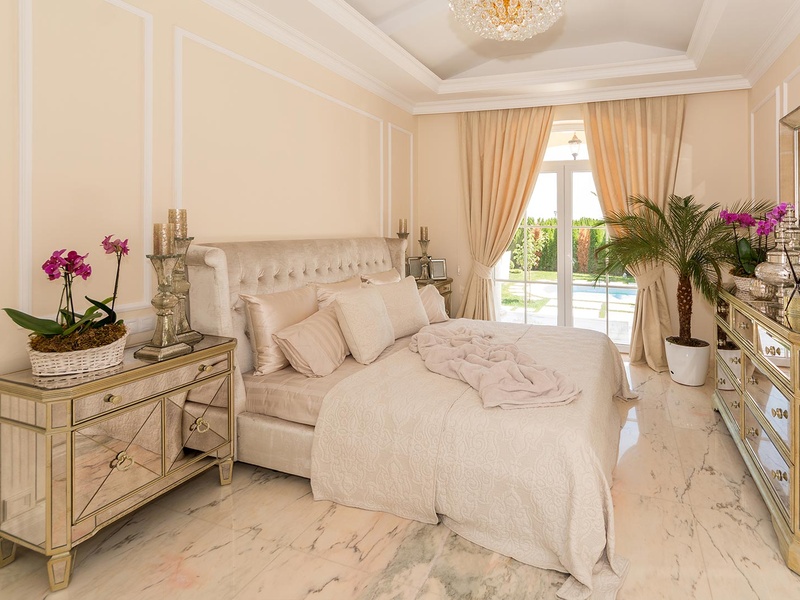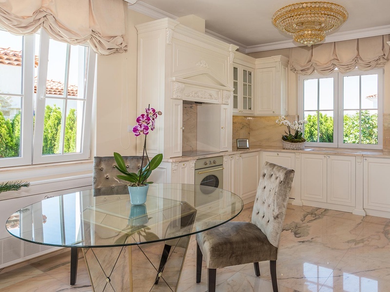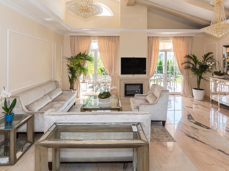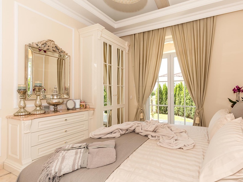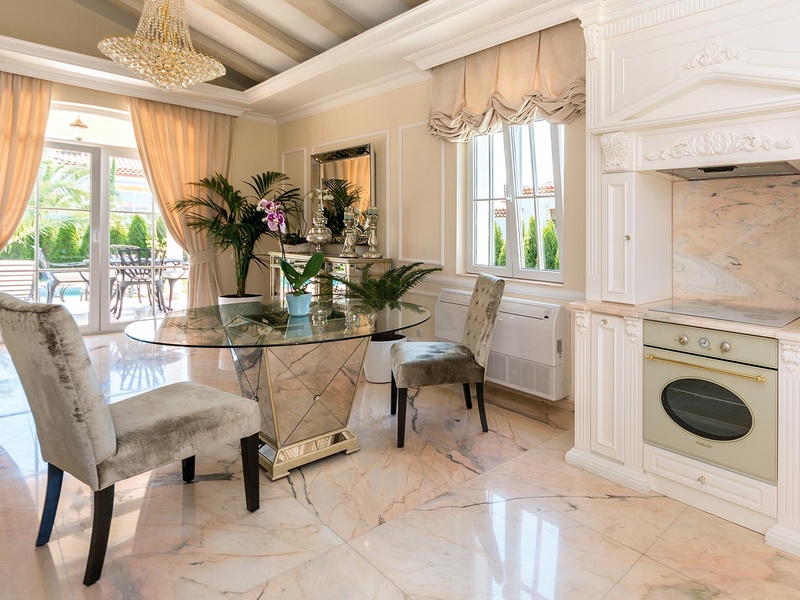 From the stately entrance to the house you enter the spacious living room. The living space and the kitchen are in an open space ensemble with areas for dining, relaxation, and entertainment, and a fireplace. To the east of the living room is a veranda to which one gets through large French windows. The veranda is partially roofed, which makes it a cosy place to rest.  The house has two double bedrooms and a common bathroom. The furnishings are really elegant with custom-made furniture. The interior is made up of fine natural materials, natural marble Rosso portogalo, and wood.  The living room and the main bedroom face the backyard garden of the house and the pool. The large swimming pool tiled with natural stone (Rosso portogalo) lies in the centre of the garden. The garden itself is planted profusely with exotic trees and flowers with space for deckchairs around the pool.