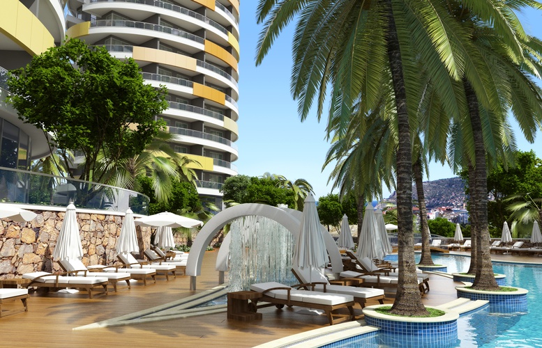 Проект, состоящий из четырех многоквартирных домов все оформления в современном стиле.Каждый блок состоит их 9 этажей, на этаже по 5 квартир, на территории комплекса находится большой сад, с тропическими деревьями, и цветами, захватывающий вид на Средиземное море, замок Алании и горы Таурус.