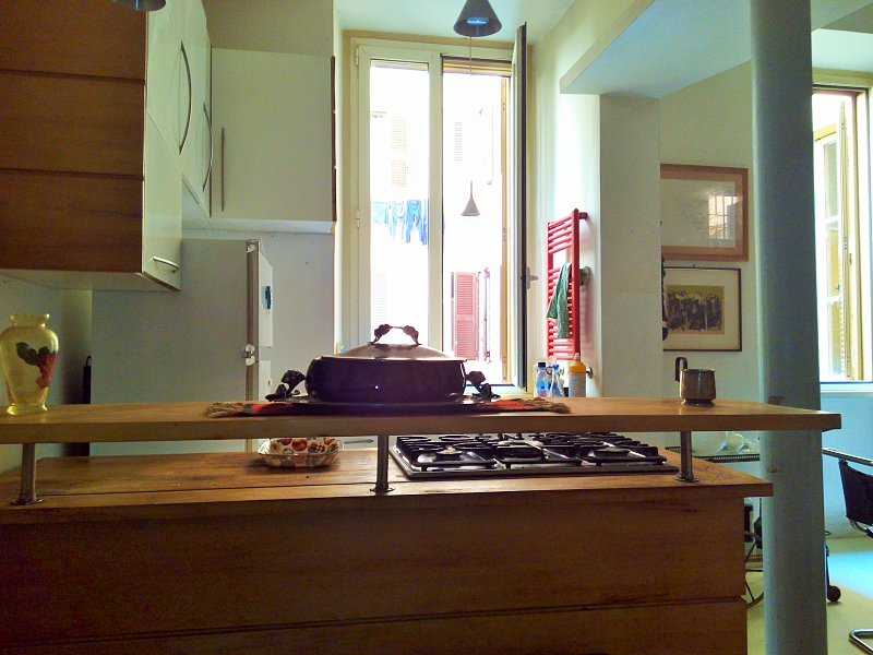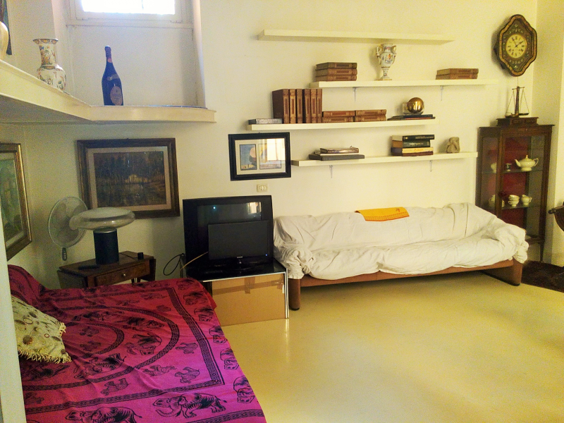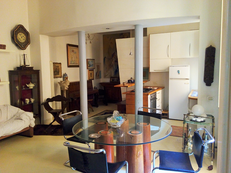 Rome, Esquilino quarter, 80 square meters, recently renovated first floor noiseless apartment. You directly enter the spacious and comfortable living room with the kitchen island. On the other side of the flat, you'll find the double bedroom with private bathroom, a studio and the second bathroom.