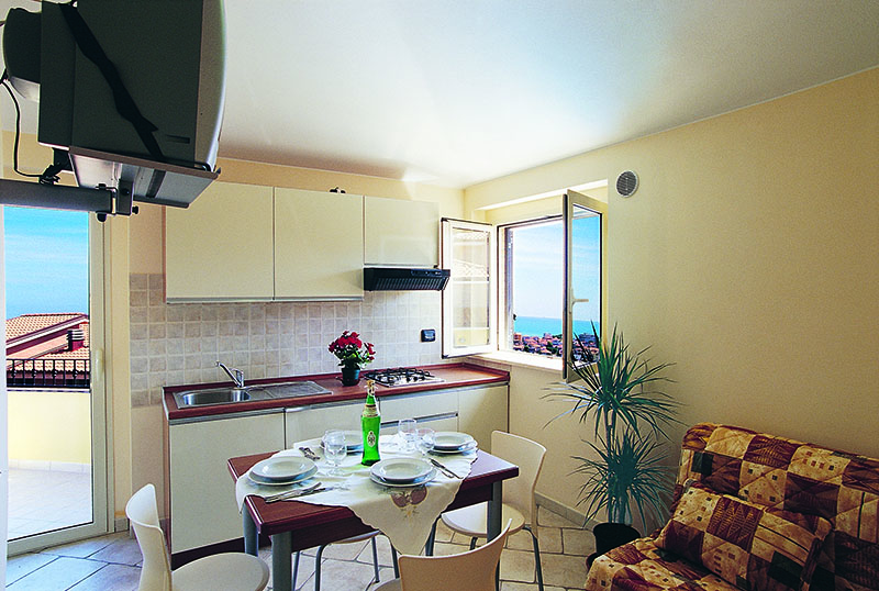 Апартаменты (двухкомнатные, трехкомнатные и четырехкомнатные ) расположены в зеленом саду с пальмами и с мини-кухней полностью оборудованой , посуда, кухонные принадлежности и аксессуары для приготовления пищи, плита и холодильник с дверцей с холодильником. Ванные комнаты сделаны с мозаикой из камня, все они оснащены душевой кабиной. Также есть цифровое ТЕЛЕВИДЕНИЕ, отопление, кондиционер на верхних этажах . В апартаментах есть балкон или терраса с видом на море со столиком и стульями.
