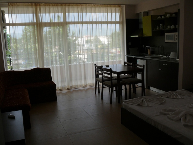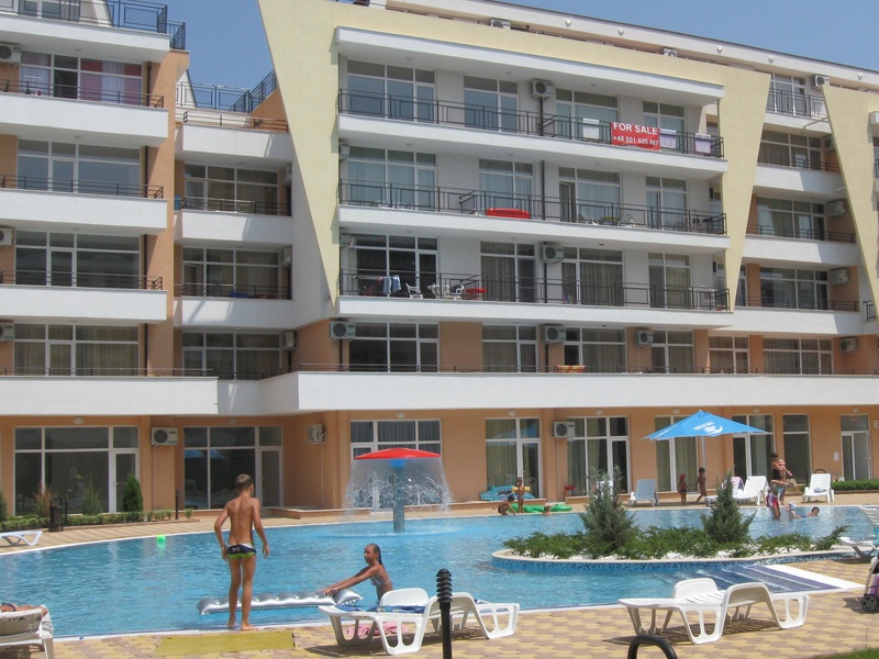 Большая студия в одном из лучших комплексов Солнечного берега. Этаж – 3 (лифт работает круглый год). Площадь – 47 кв.м. Планировка: прихожая, сан.узел, большая комната, совмещенная с кухней, балкон. Квартира очень просторная и светлая. Мебель и техника входят в цену. В комплексе два больших бассейна – для детей и взрослых, ресторан, теннисный корт, большая детская площадка, ресепшн, игровая комната. В 20 м от комплекса круглогодичный супермаркет Младость.