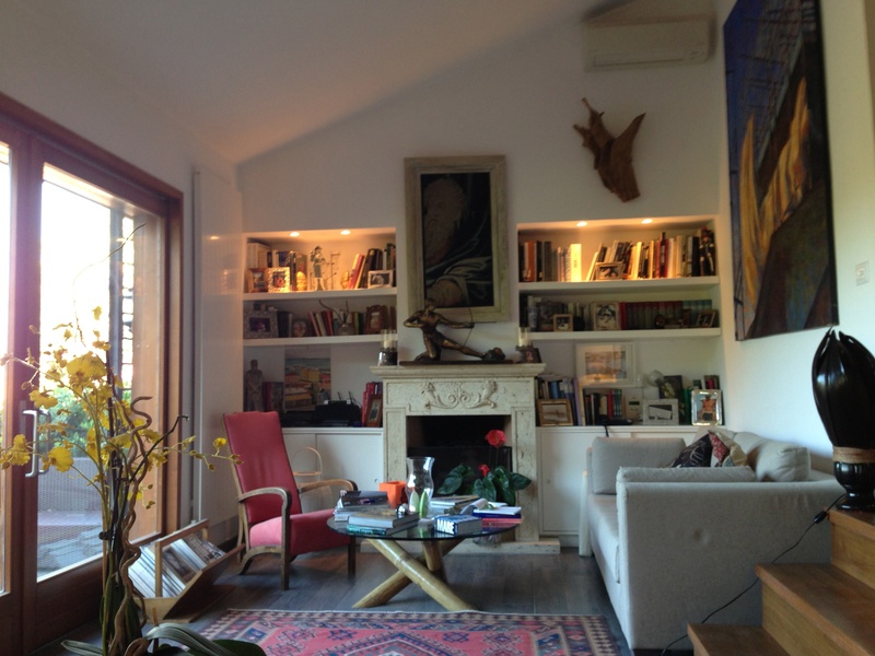 LEVEL "-1.80": rooftop lounge with stone fireplace (ceiling height mt.3,50) with glazed door to balcony and panoramic window views. Ramp in solid oak.