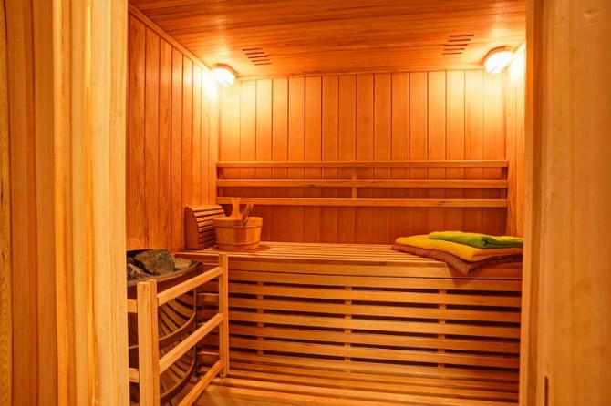 The ground floor consists of a one-car garage, a utility room with a washer/dryer, as well as a bathroom and room with a sauna.
