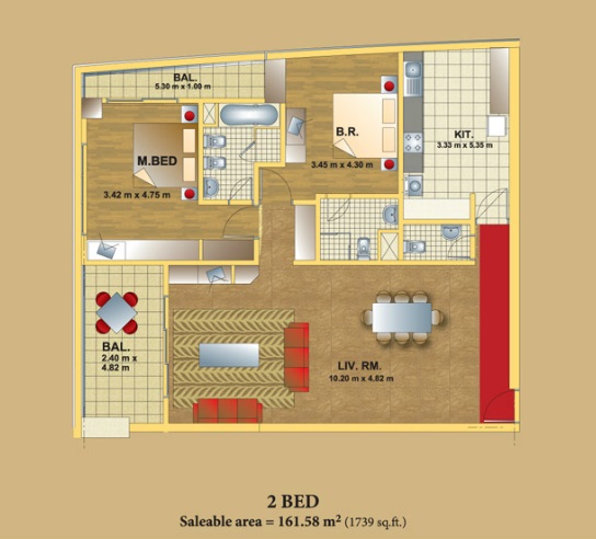 Квартира типа "Двуспальная" в здании DEC Tower (Башня D.E.C), с кухней закрытого типа, большой гостинной и балкона с видом на бухту.