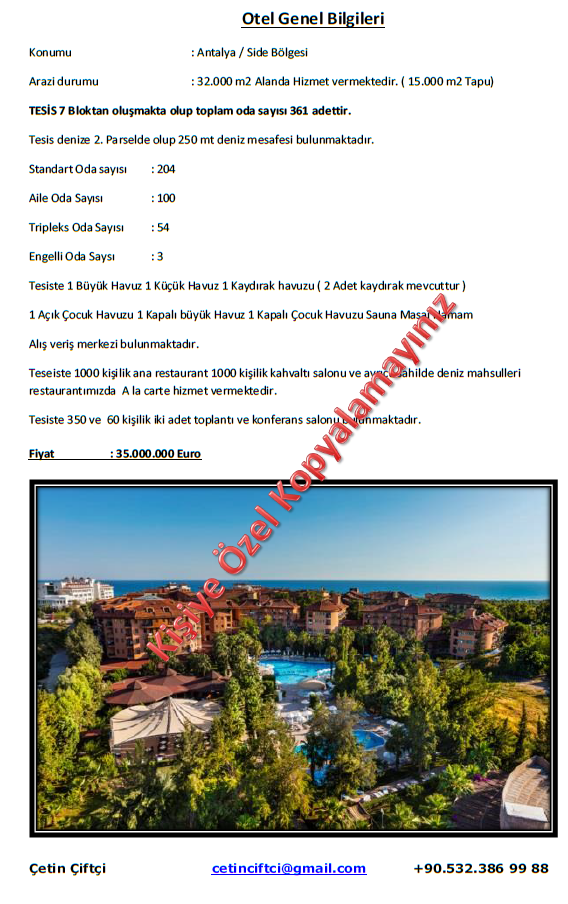 Resort, which is a member of the Hotels& Resorts, is located on an area of 32.000 m² and opened in May 1998. Renovated 2002 & 2014. It is at a distance of Sea 250 mt, 10 km to Side city centrum, 13 km to Manavgat city centrum, 45 km to Antalya International Airport.