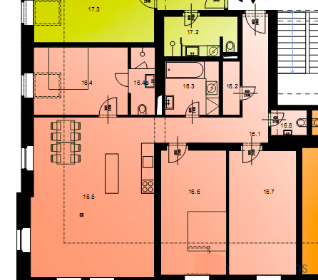 В квартире есть гостиная, которая соединена с кухней, 3 спальни, одна из них с примыкающей ванной комнатой, вторая ванная комната, отдельный туалет и техническое помещение.
