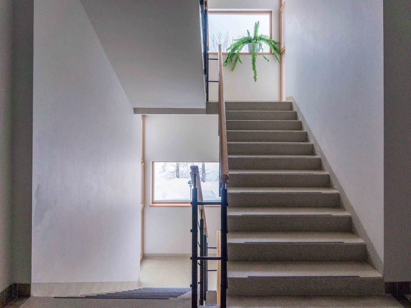The building has 4 floors with a roof construction and surface parking. The spacious green area around the building has a fenced children’s playground and a garden. The building is surrounded by the River Pēterupe that separates it from the roadside area and the surroundings. The sea is 400 m away (across Pēterupe pedestrian bridge). In the vicinity there are private house neighbourhoods.