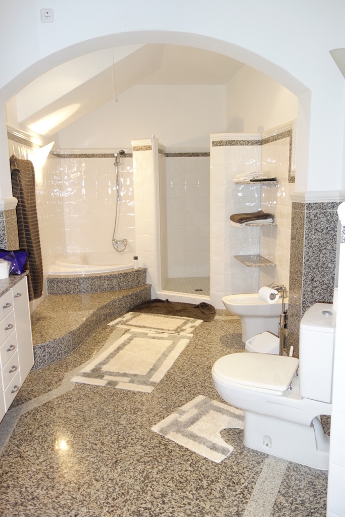 Bathroom with toilette, sink, shower, tub and washing/drying machine.
