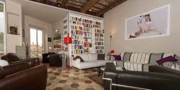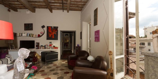 For sale Luxury apartment renovated in the historic center of Rome, Italy. In one of the most beautiful areas of the capital, a luxury apartment on the top floor of an old building with a lift (just installed). The apartment is 200 square meters 5 bedrooms, 2 bathrooms, 3 bedrooms renovated prestigious materials, but still allows you to rearrange the interior space to your liking. In this configuration, a long corridor, is the entrance and leads to the first living room. Furthermore, a bedroom with a bathroom and a covered balcony is accessible from the corridor. From the first room, two corridors along the entire length of the house, including the kitchen, dining room and guest bathroom. Master bedroom with bathroom and dressing room. The second living room is down the hall and through the double wall has an unforgettable view over the surrounding rooftops and strong light thanks to large windows. The last reconstruction was able to combine the use of new materials with old characteristic features such as high ceilings with wooden beams. It has central heating, and a comfortable and dry cellar.