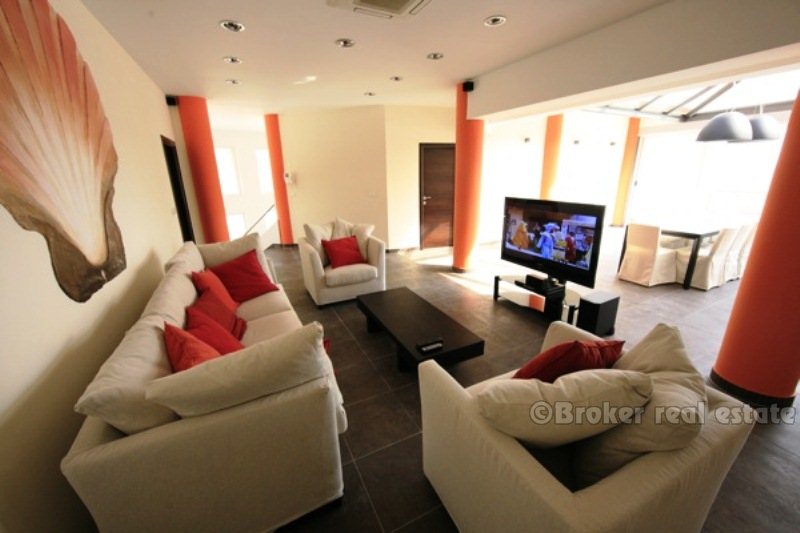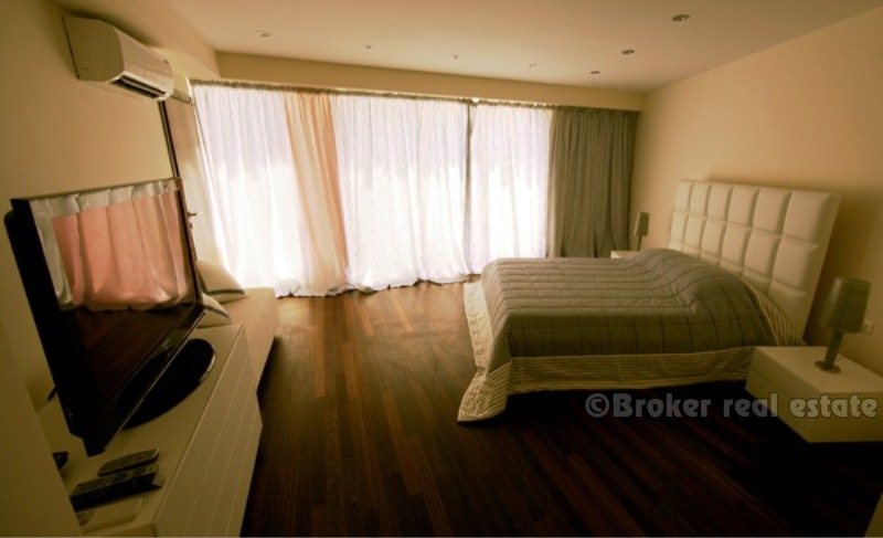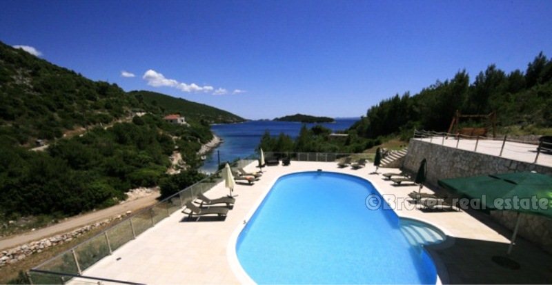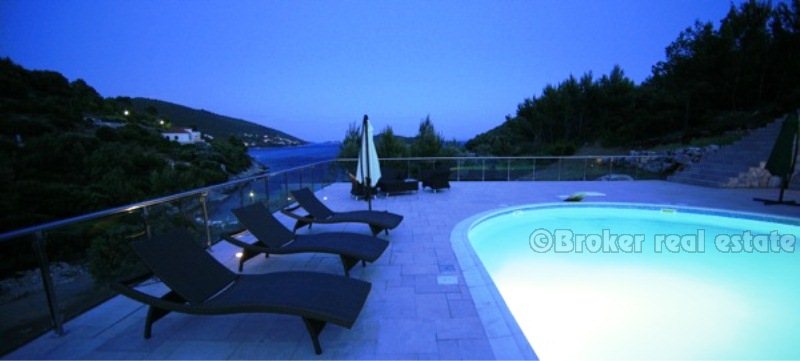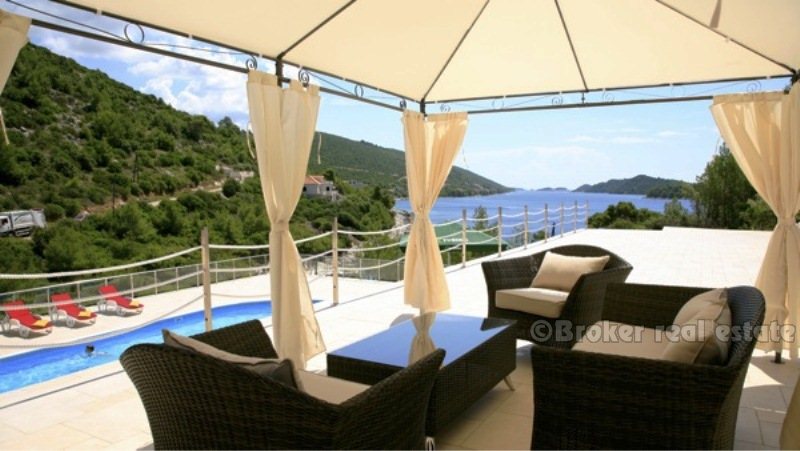 Villa for sale in Korcula island in the Adriatic Sea, in the southern part of Croatia, near the Dalmatian coast. Beautiful new villa in a small bay. Complete confidentiality. The villa is designed, built and located in attractive wooded area, which offers a magnificent sea view 180 degrees over the Adriatic. The living area of the villa 520 sqm, land area of 11,400 sq.m .. Inside, there are six bedrooms. Each bedroom has a bathroom with a jacuzzi. There are two large living rooms, one of which is located on the ground floor with large glass windows with magnificent views of the sea, installed underfloor heating. Garage for two cars, and the villa is fully furnished with designer furniture, has a 100sqm swimming pool.