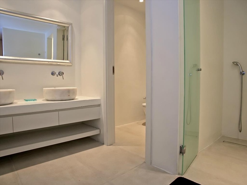 Нижний уровень: 2 двухместных номера с отдельными ванными комнатами & видом на море (душевые, туалетные комнаты, двойной раковиной, двуспальные кровати, A / C, телевизор, вид на море, выход на террасу), двухместный номер (двуспальная кровать, A / C, Телевизор, вид на море, выход на террасу) и отдельной ванной комнатой с душевой кабиной.