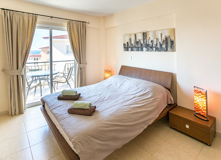 Апартаменты состоят из открытого плана кухни, просторной гостиной с выходом на большой крытый балкон с видом на море и бассейн, ванной комнаты и спальни с встроенными шкафами.