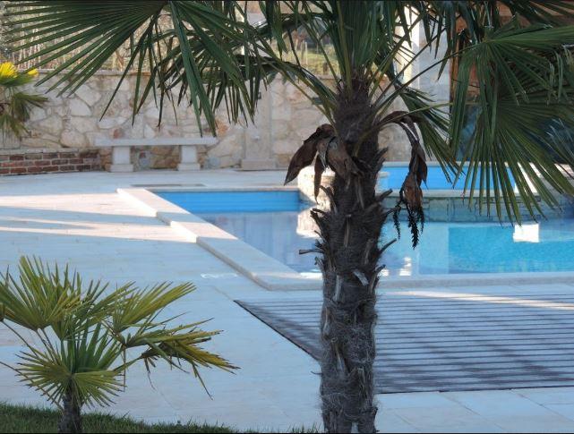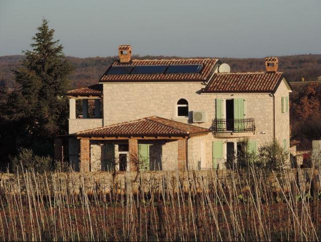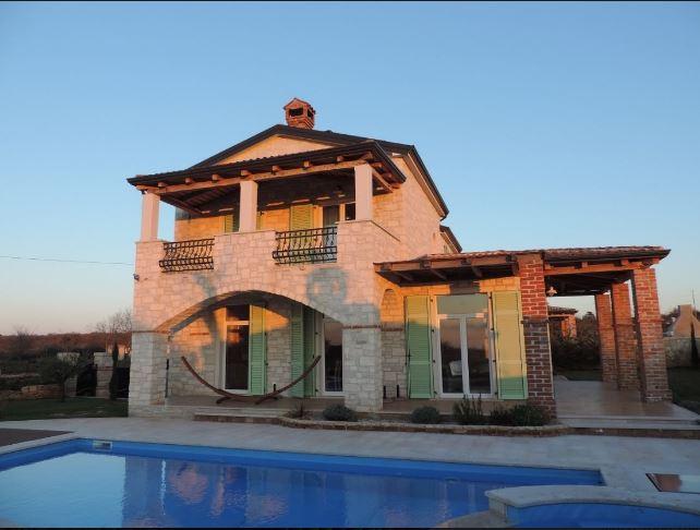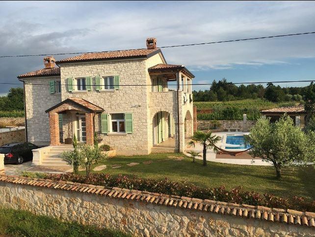 This beautiful stone house was designed with great attention to detail. A hallway with guest restroomopens up the floor and up the stairs to the upper floor and down into a tavern. A bedroom with en suite bathroom and separate terrace, which can also be very well used as an office. The spacious living and dining room has an impressive ceiling height of about 3 m and combines this with a warm, Mediterranean atmosphere and a fantastic view of the sea in the west. Eyecatcher is the big, beautifully designed, open fireplace light sandstone. The integrated kitchen in French country style is fully equipped and offers plenty of storage space. The entire living and dining area is surrounded by covered terraces. A generous staircase with large window to reach the upper floor with a total of 3 rooms. The master bedroom has an en suite bathroom, a dressing room and a small balcony. The other 2 bedrooms share a bath and go to a large covered balcony overlooking the sea. The bathrooms combine skilfully elements of country style with elegant Italian design and tile. Unusual lamps and chandeliers on walls and ceilings emphasize the Mediterranean atmosphere and in conjunction with crown molding and warm, earthy color schemes created a wonderful atmosphere to relax. All rooms have a magnificent view of the Istrian countryside and the sea. Equipment * Plot completely surrounded by a high stone wall, with electric entrance gate * Alarm and video cameras * Internet connection with 4 MB and WIFI * LAN instalations and satellite antennas in all rooms * Air conditioning (hot and cold) * Central underfloor heating with solar / electric * Energy efficiency class A * Swimming pool with Jacuzzi can be heated by solar * Tavern in the basement with fireplace and kitchenette * Barbecue house as a summer kitchen with fireplace * Autom. Irrigation * Furnished incl. washing machine The property offers panoramic sea views and is located approximately 20 minutes from Porec and Vrsar near Baderna between olive groves and grapevines. Baderna and its surroundings offer the shopping, great restaurants and bars. The basement has been created as a tavern and decorated with old oak beams and roof tiles and attention to detail. An open fireplace, spacious seating areas and a kitchenette a convivial evenings in a cozy and rustic atmosphere, a small wine cellar and a toilet. The high-quality tile floors in wood design and bright veins stretch stylistically through the whole villa and the terraces. The outdoor area with large swimming pool and Jacuzzi is surrounded by natural stone slabs and lawns. A barbeque house with fireplace and summer kitchen is another attraction. The plot is fenced by a high stone wall with integrated lighting and has an electric wrought iron gate. In conjunction with a harmonious shade gives a good view protection and privacy to relax.