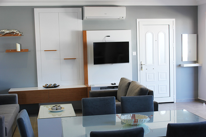 В ванной комнате большая и удобная душевая кабина.Кухня имеет открытую планировку и оборудована всем необходимым. В гостиной и столовой есть удобные, большие диваны. Так же имеется еще одна ванная комната с душевой кабиной. Все комнаты оснащены кондиционерами. Открытая терраса на крыше для отдыха на свежем воздухе. Терраса оснащена встроенным барбекю, что позволяет насладиться едой на свежем воздухе с великолепным видом на закат и море. В апартаментах есть спутниковое телевидение и WiFi. Установленная система отопления дает возможность проживать в данной квартире круглый год.