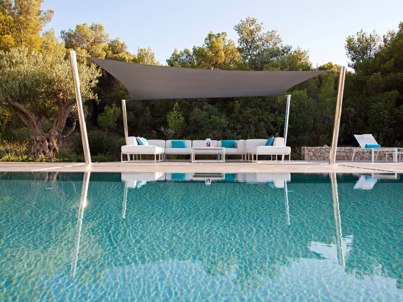 Outdoors: Shaded living space with dining room area, barbeque, infinity swimming pool and access to a secluded beach and forest.