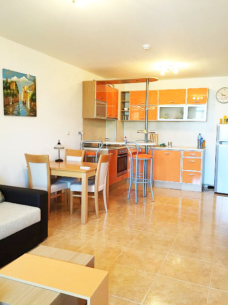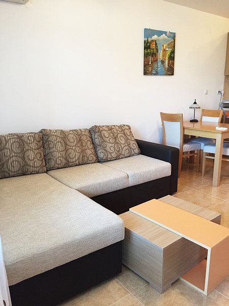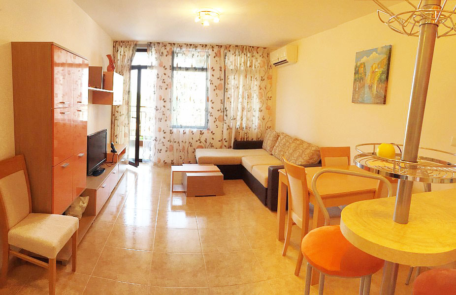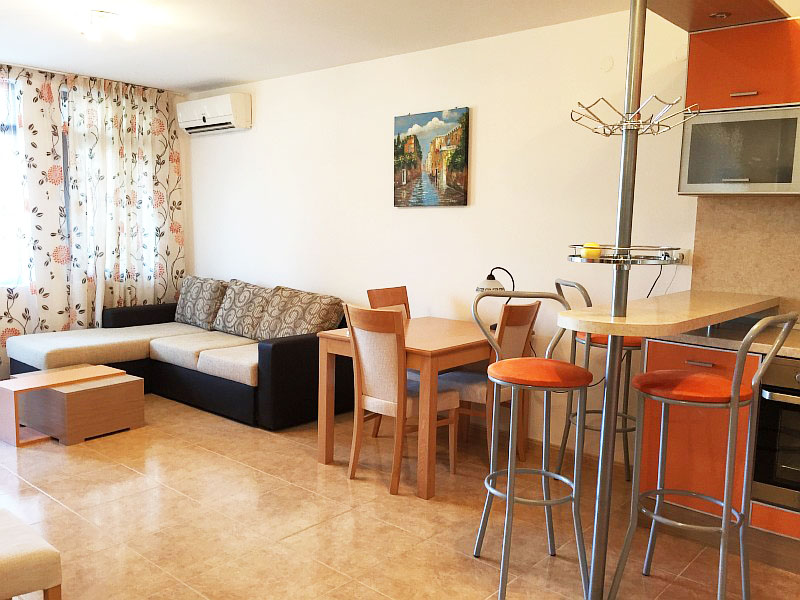Продается двухкомнатная квартира в Святом Власе с видом на море в комплексе Етъра III. Апартамент является недорогой вторичкой и продается меблированный: состоит из гостиной совмещённой с кухней, спальни, ванной с туалетом и большого балкона. В гостиной установлен угловой диван, журнальный столик, стенка с телевизором, обеденный стол и кухонный блок. В кухонном блоке установлена варочная поверхность, духовой шкаф, вытяжка, холодильник, стиральная машина. В спальне установлена двуспальная кровать, вещевой шкаф и комод. У квартиры есть большой балкон с выходами в спальню и гостиную. В санузле установлена душевая кабина. На территории есть бассейн и парковка. Комплекс находиться в 200 м от моря, в 700 м от центральной улицы "Цар Симеон" и в 500 м от порта " Марина Диневи". Квартира в Святом Власе предназначена для круглогодичного проживания.