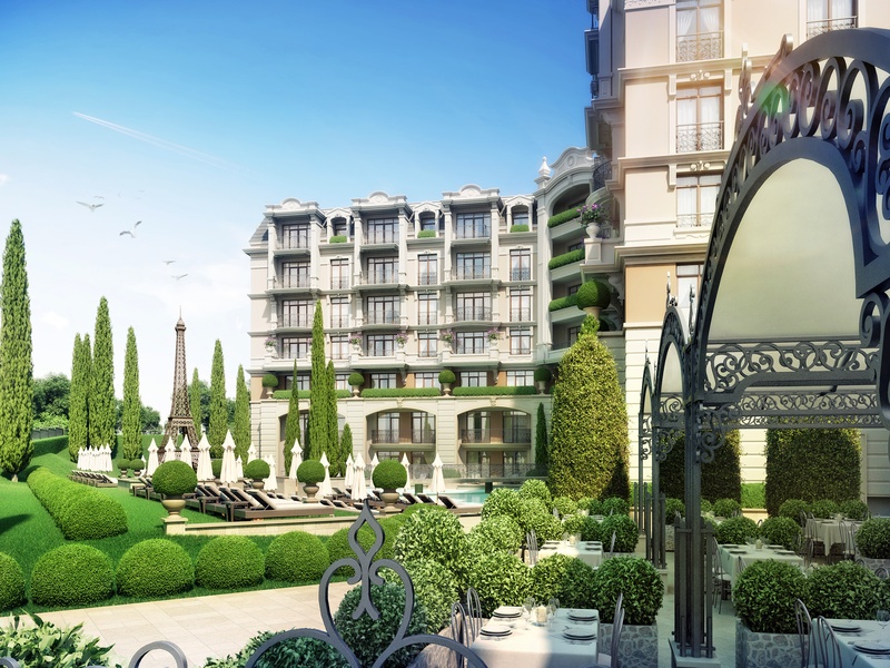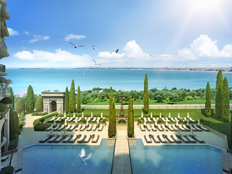 Уменьшенная копия моста влюбленных над басейном комплекса.