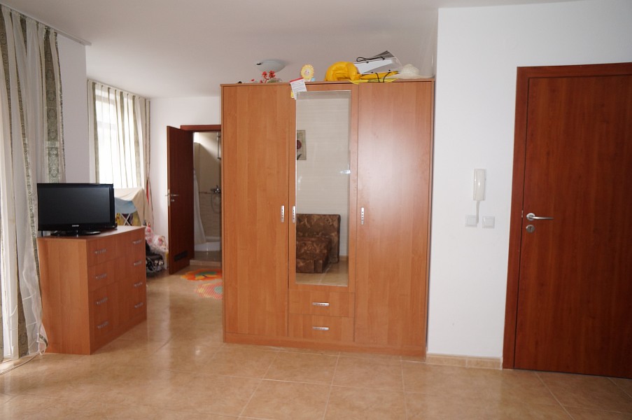 Zu verkaufen ist eine große 1-Zimmer-Studiowohnung mit einer Wohnfläche von 41 m², die im 3. Wohnstock im Komplex Etara 3 in Sveti Vlas liegt. Sie hat ein Wohnzimmer mit kleiner Küche, eine separate Schlafraumnische, ein Badezimmer plus Toilette und Terrasse. Die Wohnung ist voll möbliert und mit Haushaltsgeräten, Klimaanlage, Geschirr und Besteck ausgestattet. Sie ist sowohl für den Urlaub als auch für ganzjährige Bewohnung passend. Der Komplex ist ungefähr 200 Meter vom Meer, 800 Meter vom Zentrum von Sveti Vlas und nur 600 Meter vom Yachthafen Marina Dinevi entfernt.