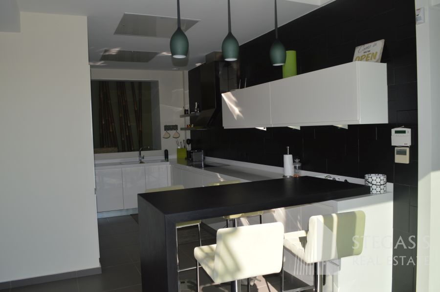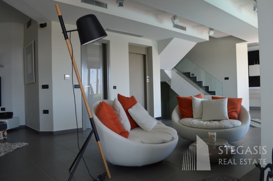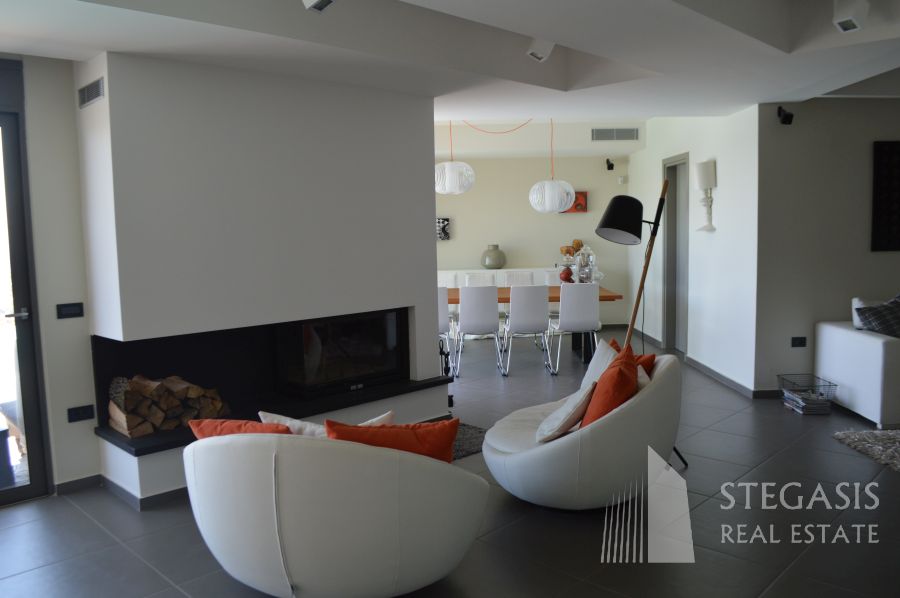 This new fantastic, luxury and modern villa is situated at only 500 meters from the Agios Nikolaos beach, the Temple of Poseidon at Sounion is 15km away, Athens International Airport is 15 km away, Athens city centre is 25 km away and Piraeus Port is at a distance of 40 km. The constructed area of 295sqm is spread over four levels: The ground floor has a big open living room with fireplace, sitting area with TV, a dining room and open space Italian kitchen with view on an overflowing swimming pool and panoramic view on the ocean. On this level we also have an office and guest WC. Outside an open terrace with outdoor swimming pool, barbecue and irrigated gardens. On the 1st floor we have small sitting area, very large master bedrooms with dressing area, and 2 additional bedrooms with a common bathroom, all this with a panoramic view on the ocean. On the highest level we have small living room with kitchenette, one master bedroom with dressing area and of course panoramic view on the ocean. The basement consists of playroom with bathroom and garage available for 5 cars with an electric opening, swimming pool equipment room, laundry room with technical room where the smart-house system is located. Highest quality during construction and expensive (designer) furniture!