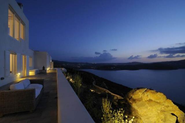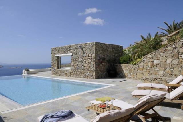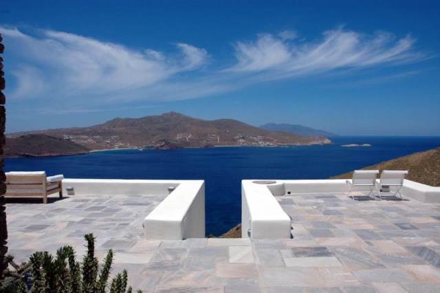 Rent a luxury villa on the island of Mykonos Greek island, one of the islands of the Cyclades, is located in the central part of the Aegean Sea, the coastline of which reaches 89 kilometers. Closest to him of the island - Andros, Tinos and Delos. The house is located on uchpstke 8000 m ², which is surrounded by a stone wall and consists of 4 independent guest houses and a small stone bedroom with bathroom next to it. On the upper level there is a central guest house, as well as a gazebo and a swimming pool (14x5.5 m), sitting area around it with sunbeds and barbecue. Central apartment (top floor) is approx. 75 m² with the master bedroom, which has a magnificent view, a spacious marble bathroom, a fully equipped kitchen, dining room and living room. Through the open stairs, get into the other 3 guest houses on the second level. Central apartment of approx. 85 m², 1 Bedroom, living room, bathroom, kitchen with dining room and a separate area with two single beds. Next to that a smaller apartment with a living area, a bathroom and 2 single beds. On the other side of the central guest house has a large suite approx. 55 m² with a bed and bathroom, as well as a seating area. The house overlooks the sandy beaches of Panormos and Agios Sostis. Beaches are very close, about 10 minutes, you can always use the pool, equipped with 8 chairs, a double sun bed and a comfortable sofa, a parking place for 5-6 cars. Twice a week cleaning of the pool and we provide daily cleaning service at 4:00, other services can be transmitted on request, such as boat rentals, private chef, etc .. Please keep in mind that we offer concierge, private chef and private driver services on request; Early booking is recommended, landing from the airport or the port can also be arranged. House total area is 380 sqm, land 8000 sq.m .. The distance to the airport 17,20 km.