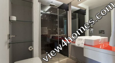 Ванные комнаты выполнены в глянцевом современном стиле и оборудованы длинной столешницей со встроенной раковиной, подвесным туалетом и просторной душевой кабиной.