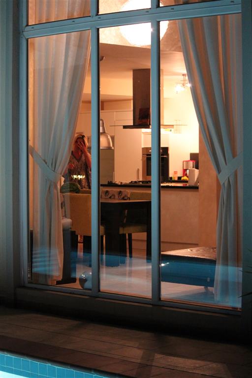In the living room there is a gallery with a glass window 4 meters high.