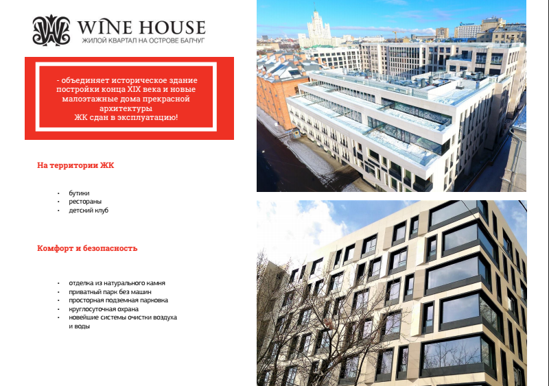 Key advantages: high-quality and original architectural concept from the leading bureau "SPEECH Choban & Kuznetsov"; Finishing of facades and common areas with natural expensive materials; Technical and engineering equipment of a high-level complex; Apartments with panoramic windows "to the floor", own terraces and the possibility of installing fireplaces (on the last floors); Underground parking with seasonal pantry, guest parking; A spacious courtyard (with landscape design) closed off traffic.