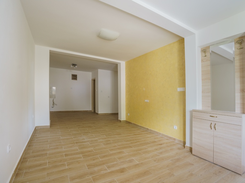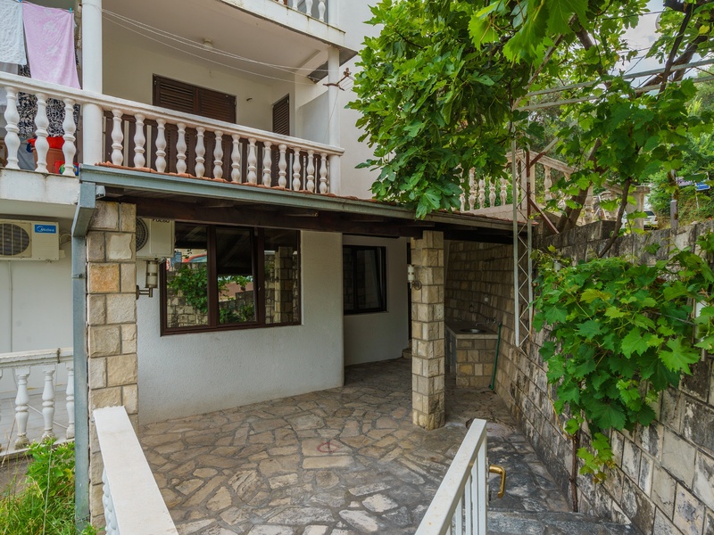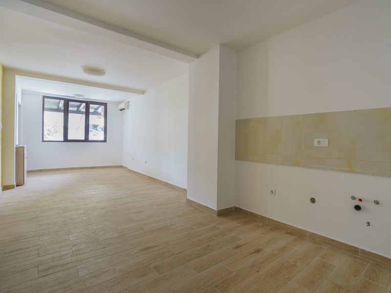 Cozy apartment with one bedroom in Budva. The apartment is great for living and renting. The apartment is on the first floor and has a small cozy patio 26 m2 in which you can equip a recreation area and barbecue. The apartment also has a technical room of 7 m2. Layout of the apartment: entrance hall, living room with kitchen and dining area, separate bedroom, bathroom with shower and toilet. The apartment is for sale without furniture. The building is located on a quiet green street. To the sea and the beach only 350 m, 200 m to supermarkets, a market with local products, shops, restaurants, cafes, a pharmacy, banks, a shopping center, a cinema and other infrastructure. Parking in front of the building.
