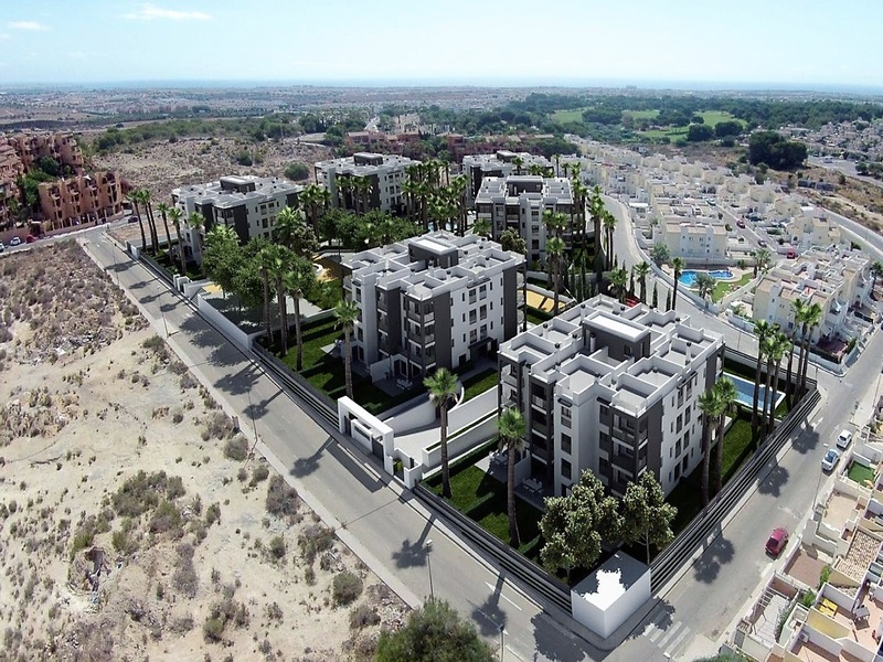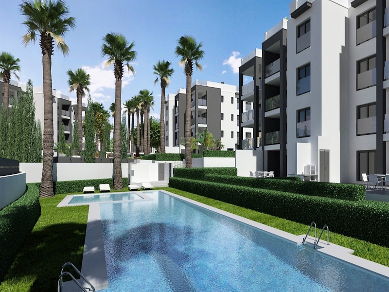 Apartments for sale in the 2nd of the 6 blocks of a new project in Villa Martín, in Orihuela Costa. The complex is located at only 200 meters from the prestigious golf courses Villa Martín. This is a private residential complex with common gardens, swimming pools, children's playgrounds and an underground parking. All apartments dispose of 1 or 2 bedrooms, 2 bathrooms and a parking space at the underground parking. Apartments located on the ground floor also dispose of their own garden areas adjacent to the apartments. Apartments on the upper floors have their own private terraces on the top of the building.