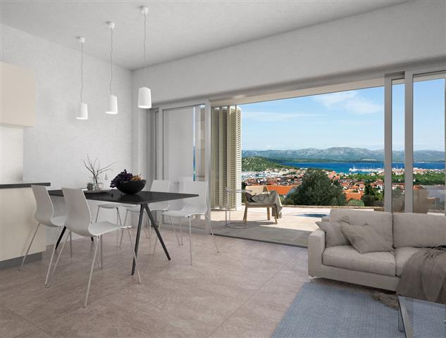 The villa has four apartments located on the island of Murter in the village of Murter, on the northern slopes of Raduč, overlooking the Kornati islands. The villa has four apartments of 71.75 m2 to 86.36 m2. Each apartment has two bedrooms, a spacious living room with dining area, a bathroom with a toilet and a large terrace. Each apartment has two parking spaces and cellar basements while the apartments on the ground floor have swimming pools of 24 m2 and 14 m2 and their own gardens. The price of individual flats ranges from 220,000 EUR to 245,000 EUR. The sea is less than 500 m away and the facility is close to all the necessary facilities.