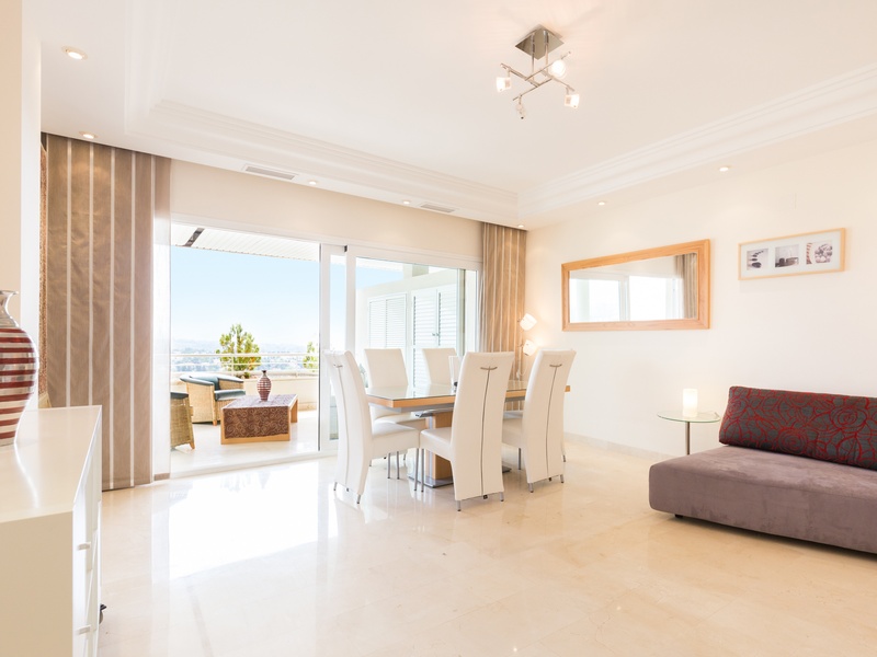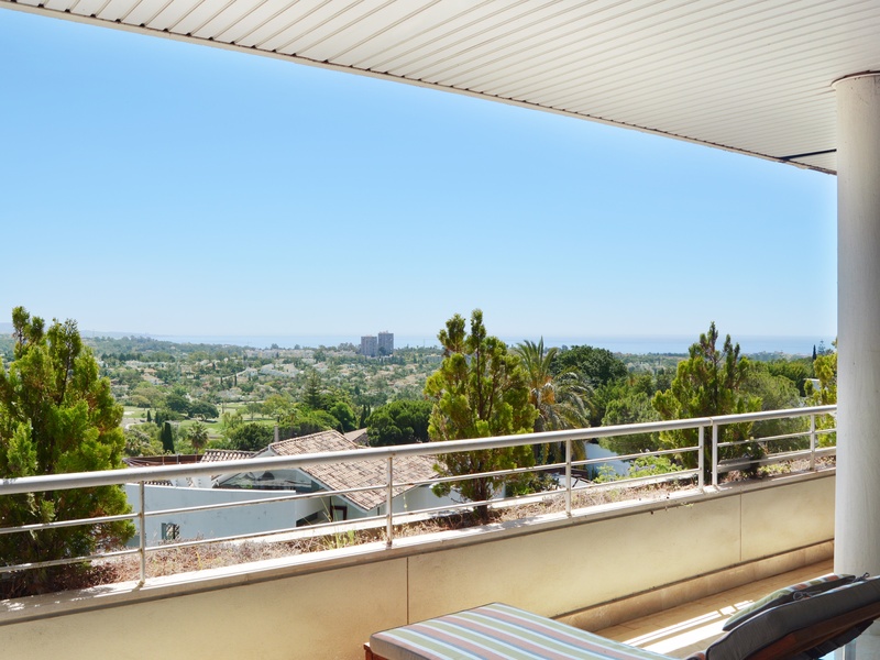 Very bright two bedroom apartment located in the sought after golf valley of Nueva Andalucia, near Puerto Banus, with excellent views of the manicured greens and fairways of the prestigious Las Brisas Golf Club and Mediterranean Sea and mountains. Beautiful ample South East facing terrace. Underground parking for 2 cars and a storage room are included in the price. There are two large pools (one is heated) and a paddle court. Gated urbanization with 24 hours security , residents and guests can access the private underground parking lift from the door of the apartment. It is situated in a quiet area within walking distance to local amenities and even the resorts of Puerto Banus. Golf lovers also have their pick of the best golf courses including Aloha , Los Naranjos and La Quinta Golf and Country Club just minutes away. El Corte Ingles is just a 3 minute drive away, the Golden Mile and Old Town Marbella are only at a 10 minutes’ drive