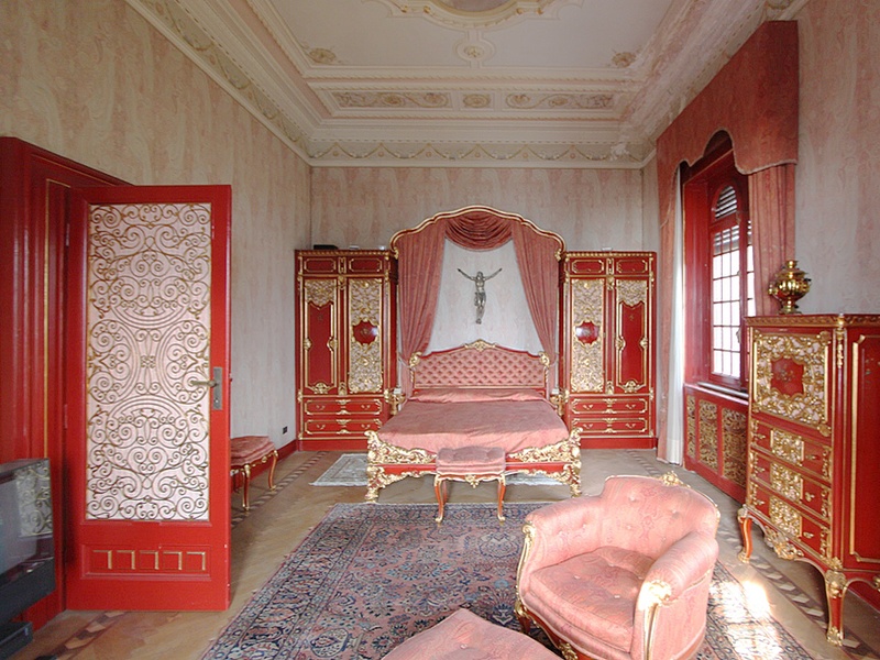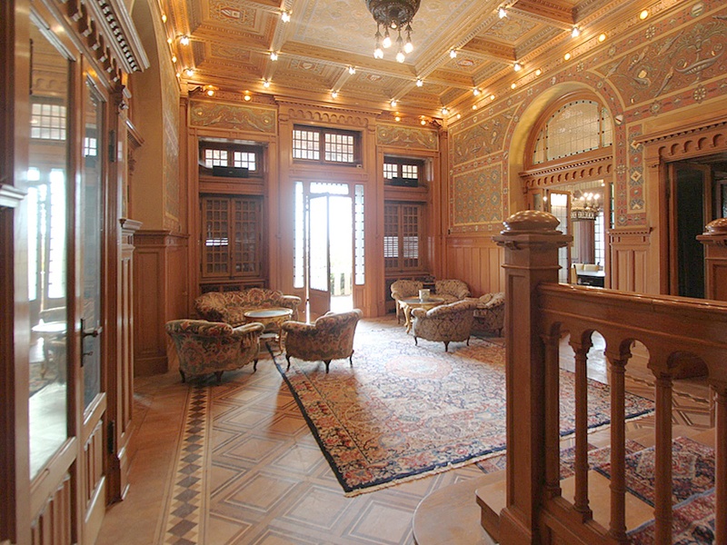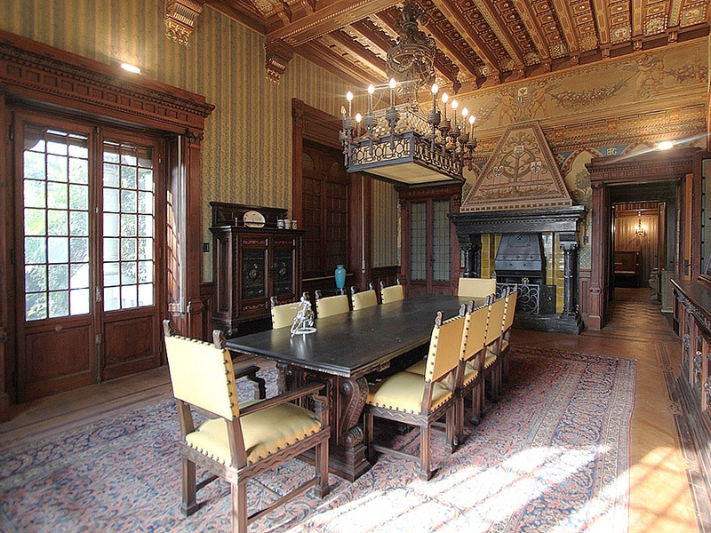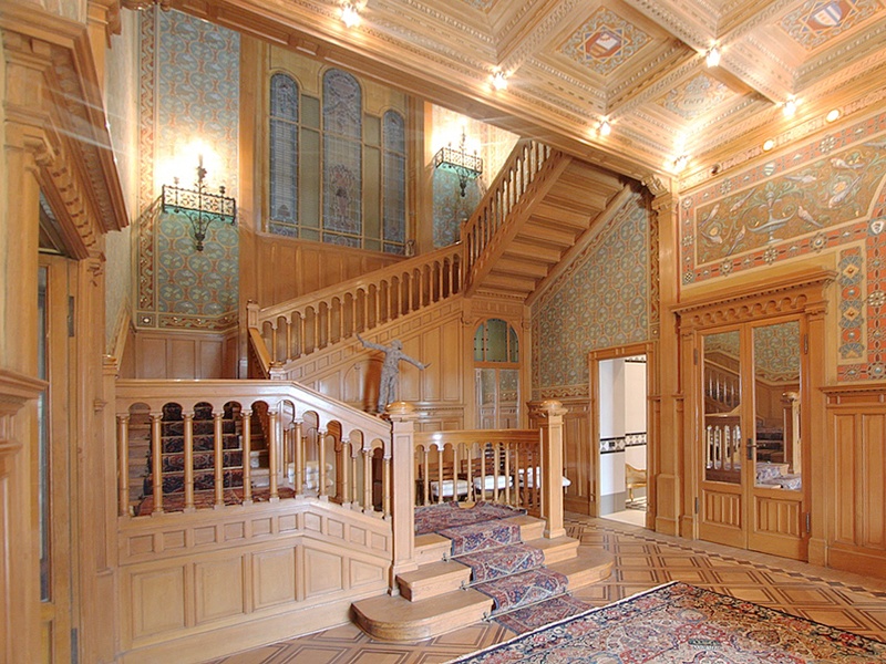 Резное дерево редких пород, элегантная антикварная мебель, невероятной красоты потолки и люстры, камины, как произведение искусства.
